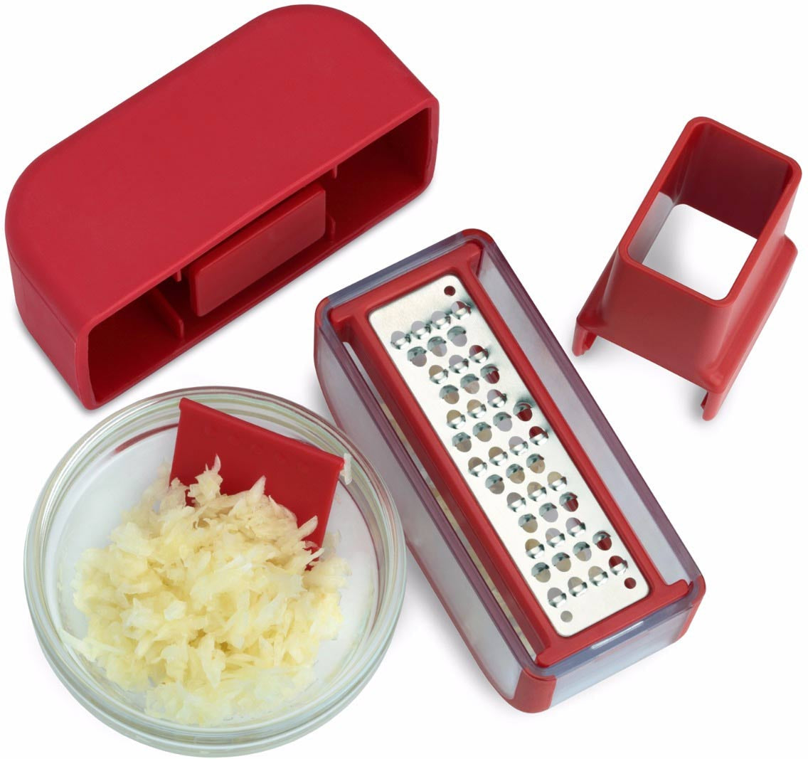 Designed to make prepping garlic easy, the Garlic Set comes with 2 blades – one for mincing and grating garlic and the other for slicing. Featuring an original, made-in-the-USA Microplane blade, the Garlic Set eliminates the need for knife skills to evenly cut small peeled cloves. Hands remain odor-free when preparing an array of dishes featuring garlic. Extremely easy and fun to use.