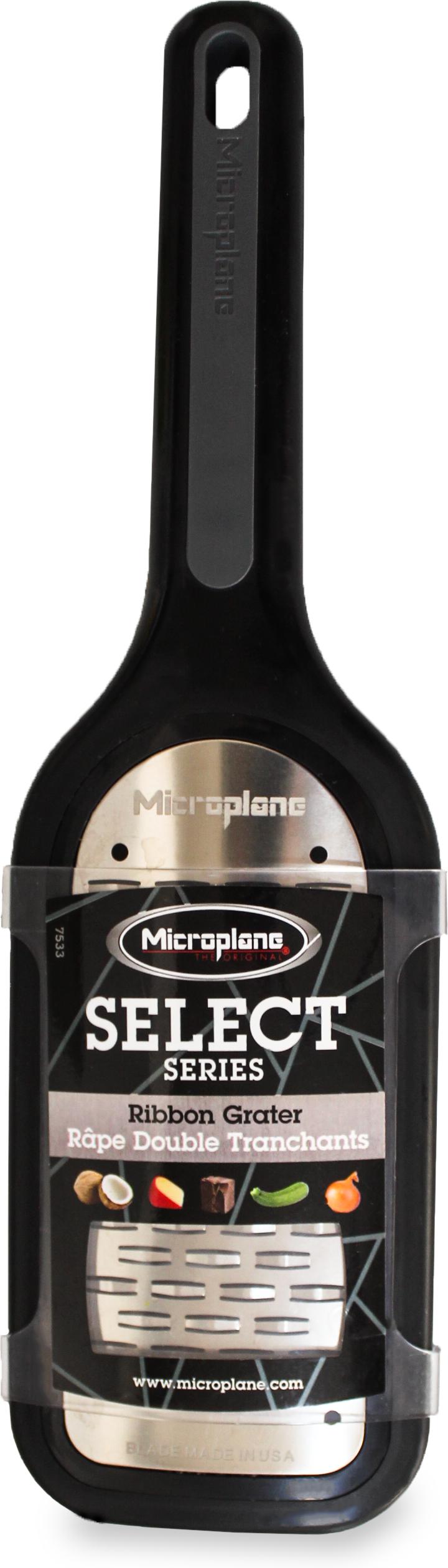 Handsomely crafted in a dazzling black frame, the high-performance Select Series Ribbon Grater was designed with both the professional chef and home cook in mind. Microplane's sleek and ultra-sharp Select Series Graters feature the company's stainless steel blades with extremely sharp edges that quickly and effortlessly cut through hard and soft foods without tearing. For added convenience and practicality, the new Select Series graters are dishwasher safe and come complete with a clear protective cover for safe storage in kitchen canisters and inside drawers.