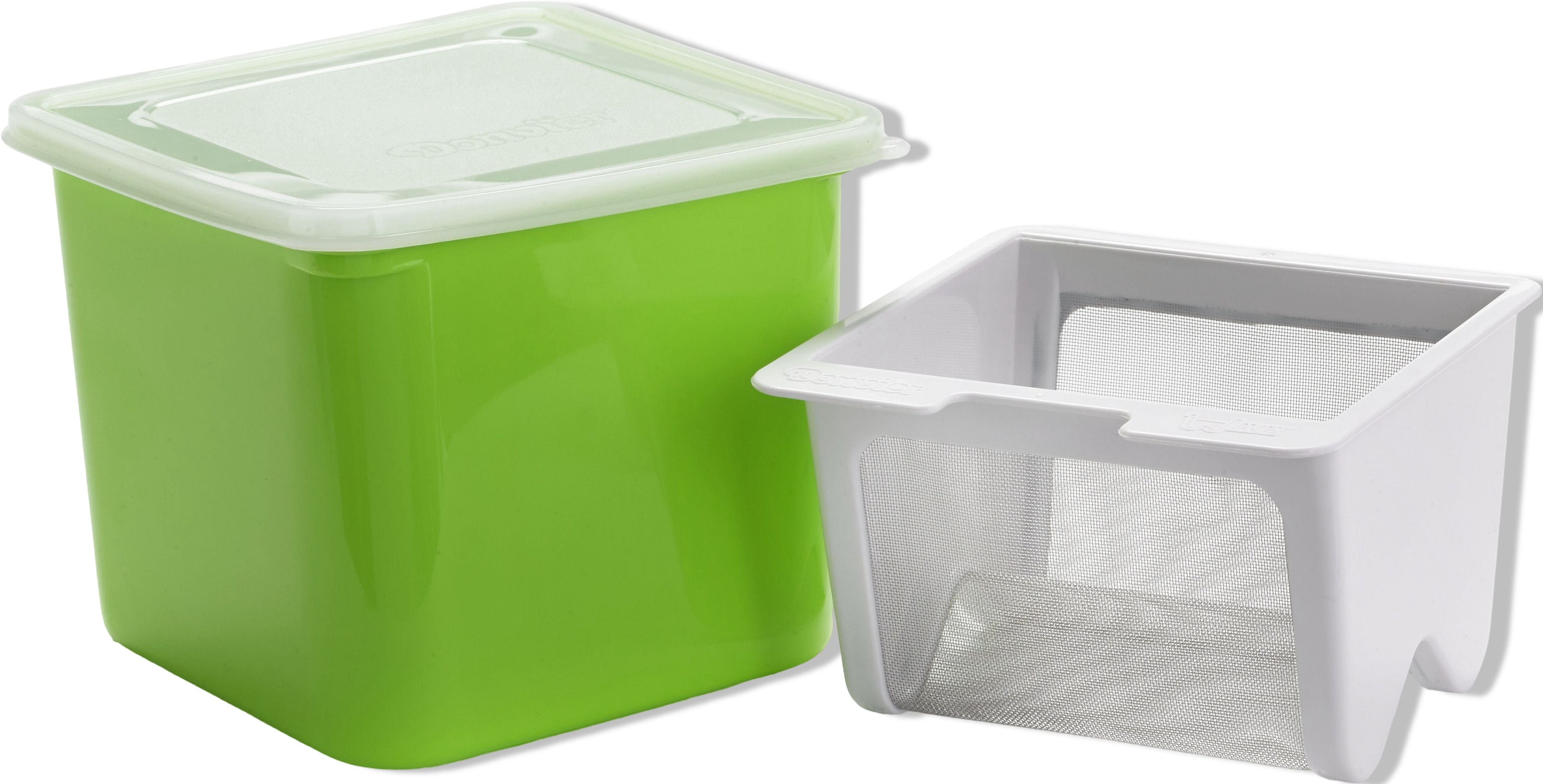 • Unit consists of plastic container, stainless-steel fine-mesh strainer and lid