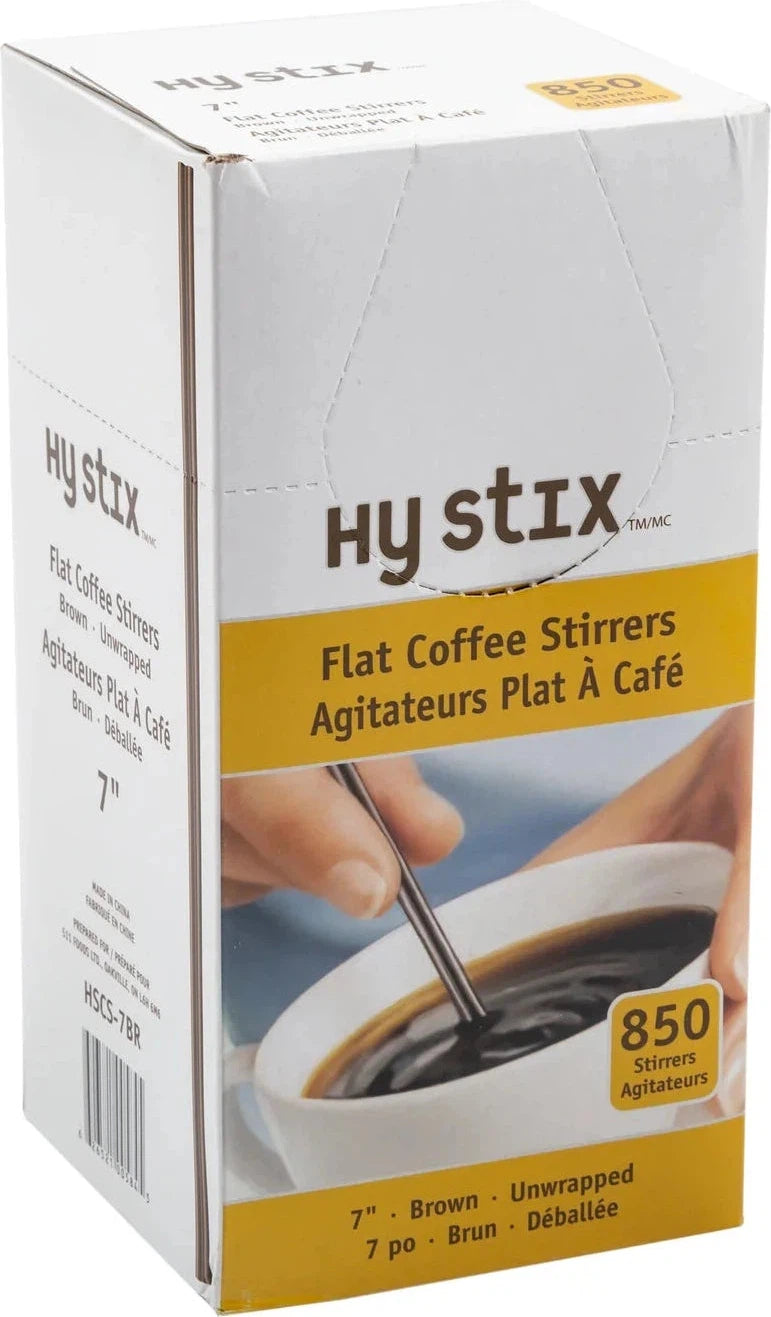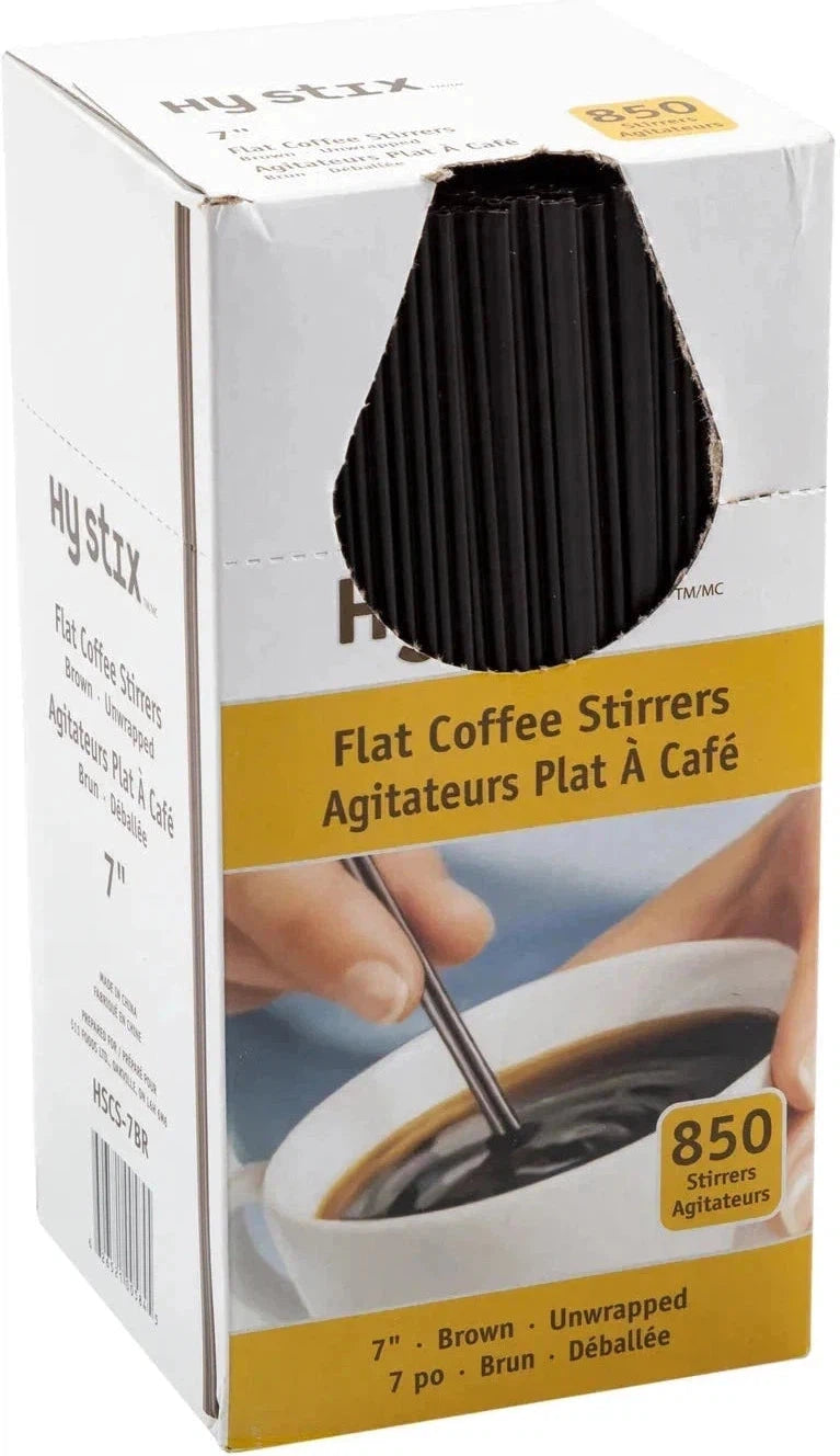 Hy-Stix 7" Plastic Brown Flat Coffee Stirrers, available in a box of 850. These attractive coffee stirrers are designed for serving coffee and hot beverages to customers. With a slender design and brown color, they are suitable for both formal events and everyday use, providing a convenient and hygienic alternative to using spoons. Your coffee and hot beverage service with Hy-Stix 7" Plastic Brown Flat Coffee Stirrers. Enhance the customer experience with these attractive and practical stirrers, suitable for both formal events and everyday use.