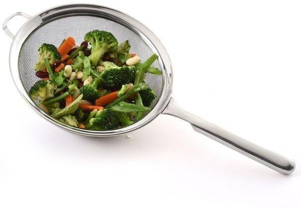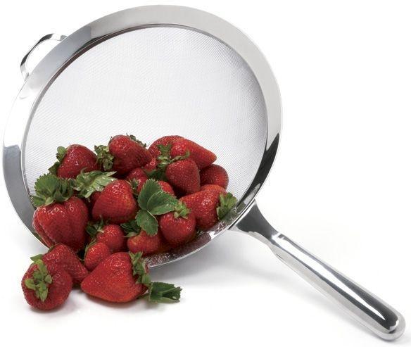 Solidly constructed from high quality stainless steel - from the two layers of tightly woven fine mesh to the thick handle and strong rivets, this strainer won’t bend under the weight of food. You get a finer strain with a double mesh strainer! Sift, strain and rinse! Great for sifting dry ingredients like flour, sugar and spices. Also use for rinsing fruits and vegetables or fine grains and pastas. Strain sauces and gravy or remove seeds from squeezed fruit juices. Premium quality comfortable large handle with convenient finger grooves for easy handling. Solid resting ring designed to hook over bowls for hands free pouring and a beautiful, broad mirrored rim design.