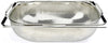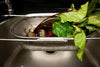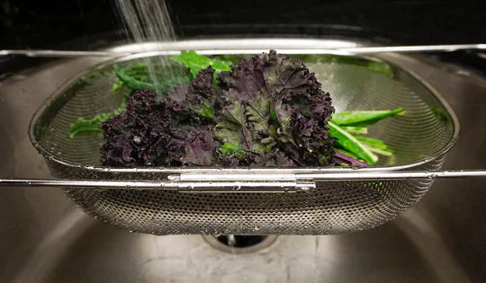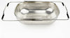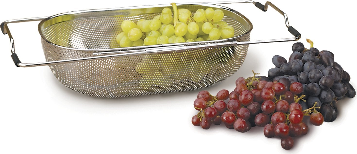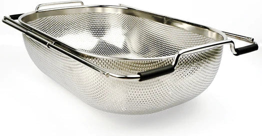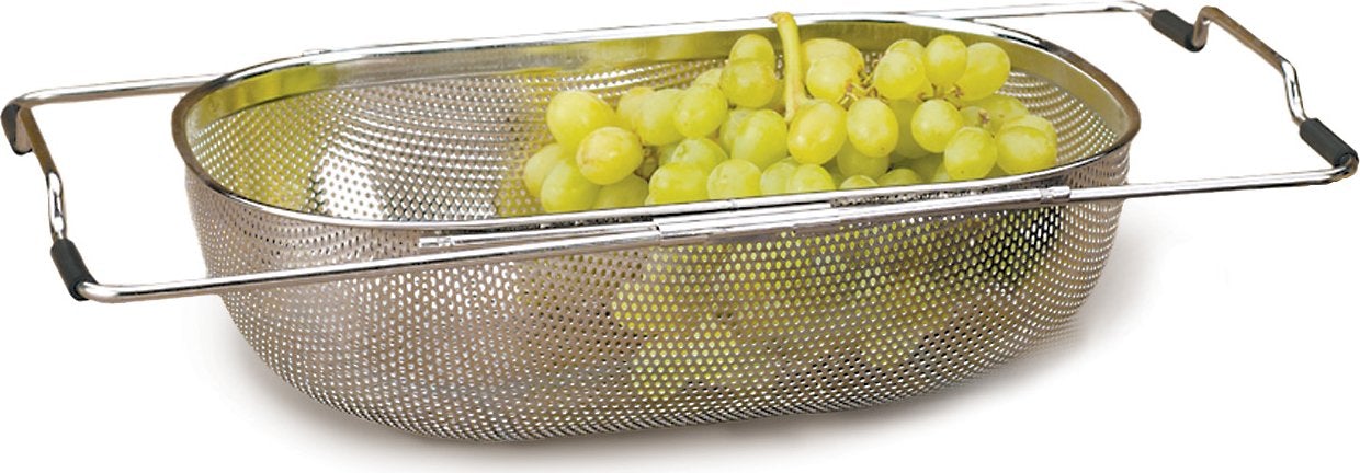 This fabulous over-the-sink drainer utilizes our famous precision-pierced drainage system. Great for big batch draining of fruits, vegetables or even pasta! Made from 18/8 stainless steel with arms that extend from 14-1/2″ to 22″ when fully open. Handles are easy to hold and rubber grips the edge of the sink rim. Dishwasher-safe.