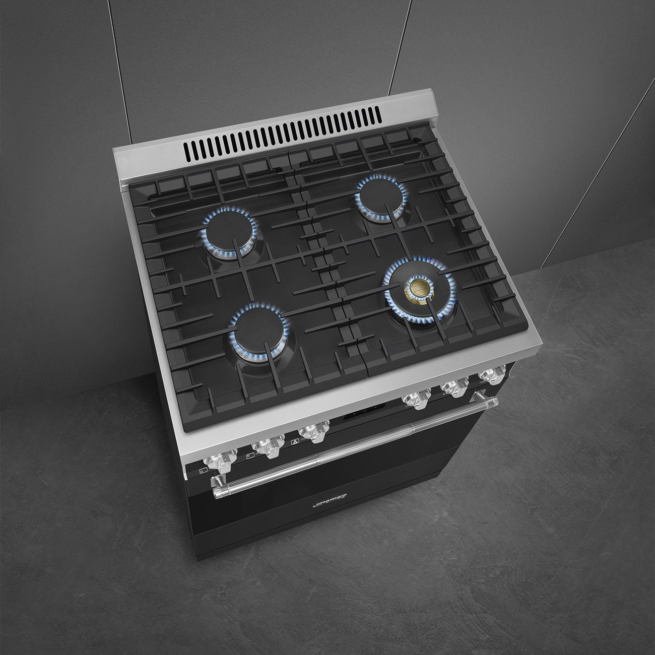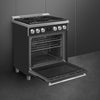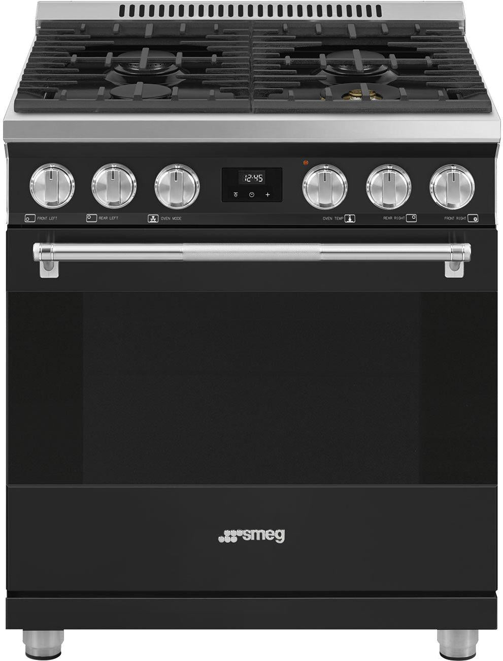 The Smeg SPR30UGGAN 30-inch Professional All Gas Range delivers powerful cooking performance combined with refined Italian design. Featuring four sealed gas burners, including an ultra-rapid 18,000 BTU burner, this range offers precise heat control for everything from gentle simmering to high-heat searing. The spacious 4.56 cu. ft. oven is equipped with CircoGas convection, an EverClean enamel interior, and multiple rack positions to handle everyday meals or large family gatherings with ease. Thoughtful details such as a soft-close, triple-glazed door, tangential cooling system, and intuitive touch and knob controls ensure safe, comfortable, and efficient operation. Finished with a professional matt black front panel and robust pro-style accents, this range is built for both performance and visual impact.