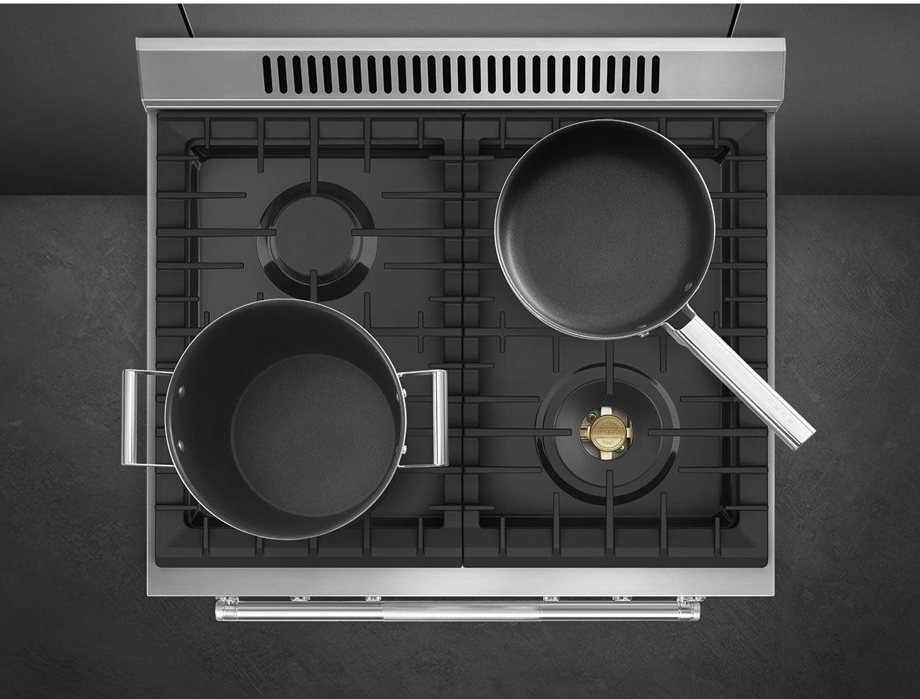 - Continuous cast iron grates allow smooth movement of pots and pans