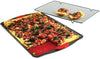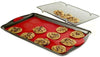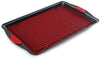 Baking sheet set offers all you need to create batches with ease. Baking set includes nonstick baking sheet, silicone mat and cooling rack. Nonstick baking sheet is 19.25" x 12" x 1"/49cm x 30.5cm x 2.5cm. Inside: 16.75" x 11.25" x .75"/42.5cm x 28.5cm x 2cm. Red silicone mat is 16" x 10.5"/40.5cm x 26.5cm and heat resistant up to 450˚F/235˚C. Cooling rack is not intended for the oven. Also silicone mat protects nonstick baking sheet and makes for easy clean up! Includes a 16" x 10" / 40.5cm x 25.5cm cooling rack for quickly cooling down baked goods and grid eliminates baked goods from slipping through the rack. Protects your counter tops while baking sheet rests on cooling rack. Recipe included.