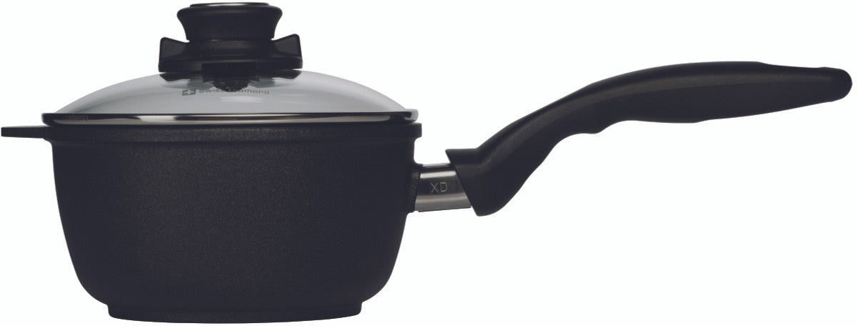 No time to scrape burnt spaghetti sauce off the bottom of your pot? No problem. Thanks to high-quality European craftsmanship, the Swiss Diamond 1.4-quart (6.3 inch) Saucepan cleans up quickly and easily. The tempered glass lid is clear to prevent overcooking and has reinforced stainless-steel rims for added durability. A sliding lever in the knob opens for optional venting.
