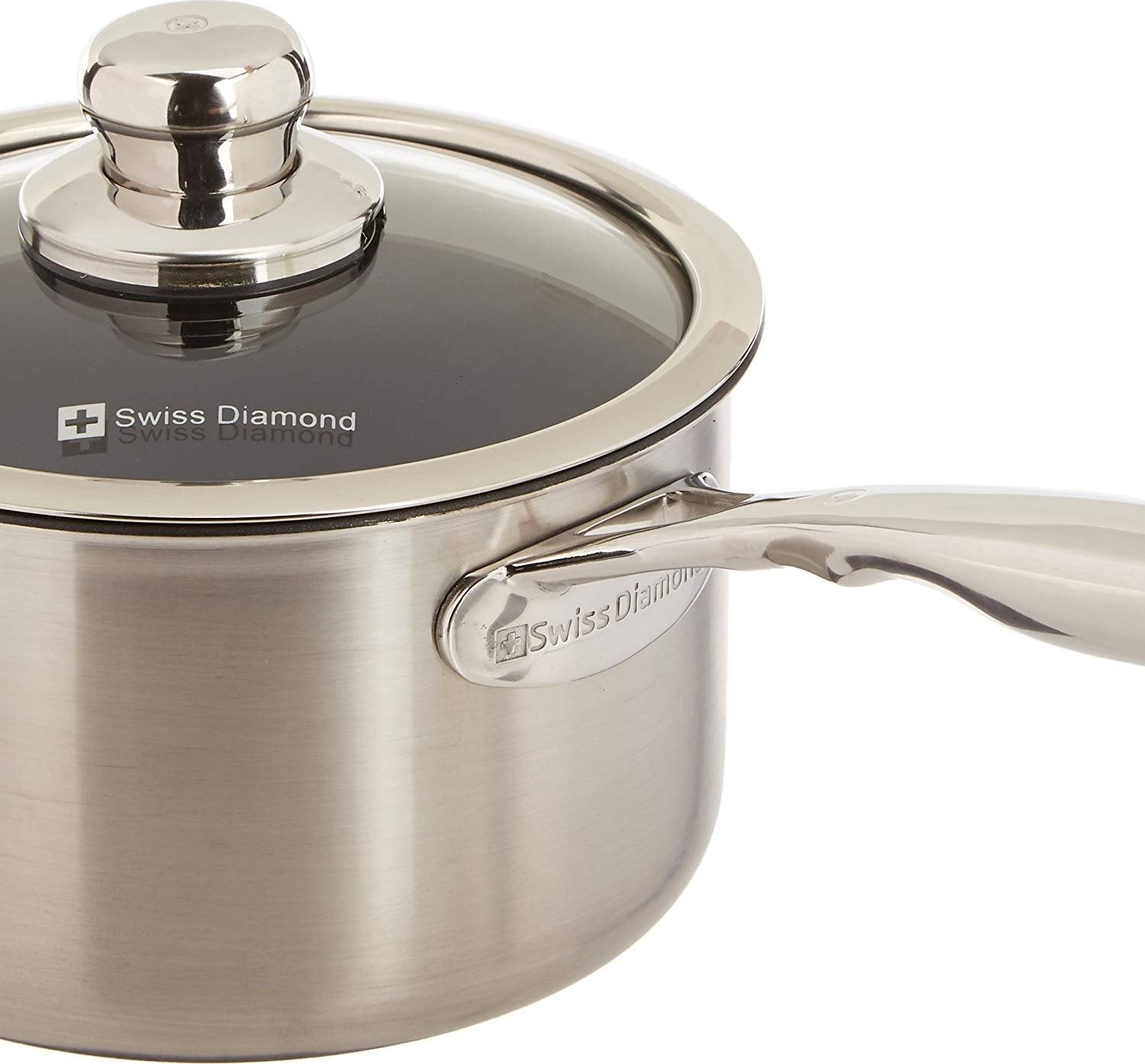 Thanks to Swiss Diamond's XD nonstick coating, this Nonstick Clad 2.6 quart (7") Saucepan is ideal for simmering soups, steaming vegetables, or even melting delectable chocolate sauce. With superior performance and a beautifully-sleek stainless steel body, this saucepan is a must-have for any busy kitchen. With see-through lids made of heat-tempered, oven-safe glass, you can cook until your heart is content and sneak a peek without releasing much-needed moisture. The lid features a stainless steel cast arch-style handle for ease of lifting on and off the cooking vessel. The lid also features a single-steam release valve to ensure that the lid will not bounce and rattle during cooking.