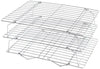 Stacked cooling racks allows you to cool dozens of cookies or pastries, or three cakes or pies all at once while saving counter space. Sturdy construction 3-Tier cooling rack, use together or separately! Place hot cookie sheets or pans on a cooling rack to protect your counter top from heat. Specially designed feet hold racks higher for better circulation and faster cooling. Racks knock down when not in use for easy storage. Constructed of chromed steel. Hand washing recommended.