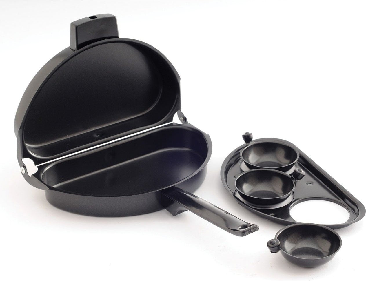 Make breakfast easy and hassle free. Make your perfect omelets filled with your favorite fixin's and poach eggs all with the same pan. Made of Xylan nonstick coating for easy release and cleaning. Egg poacher insert with removable cups. Stay cool handle. Handwashing recommended.