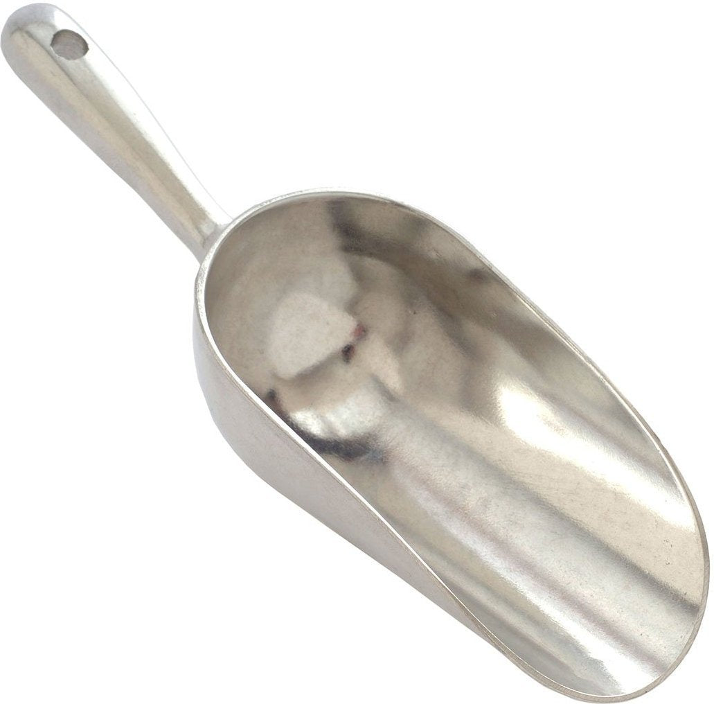 Heavy duty aluminum scoop. Made of die-cast aluminum. Finger grooves in the handle to prevent slipping. Do not put in dishwasher.