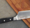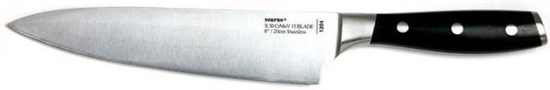 Features stainless molybdenum Vanadium steel with tapered grinding and stone finished blade. Comfortable, ergonomic soft grip handles. Full tang, double bolsters for superb balance. Handle is made of ABS plastic, the highest grade of plastic. Hand wash - never put knives in dishwasher, it will dent and chip the blade.