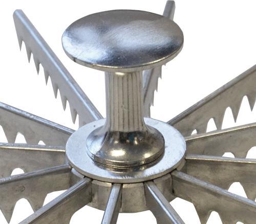 A neatly-sliced cake or pie shows the professionalism of your restaurant. Our aluminum slice pie marker helps you to evenly mark your pies and cakes. It help to ensure that you deliver the same portion of cake and pie every time. It features 9-teeth on each arm and a removable knob for easy cleaning and space-efficient storage. This marker is also great for quiche, pot pies etc.