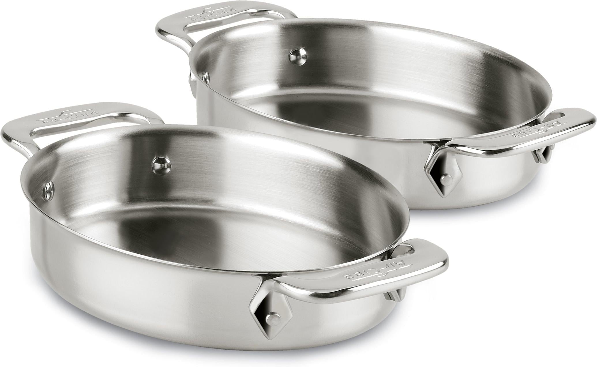 Pair of stainless oval bakers with small iconic All-Clad loop handles. Serve individual portions of side dishes or desserts, like au gratin potatoes, ratatouille, or apple crisp. 22-ounce capacity.
