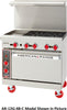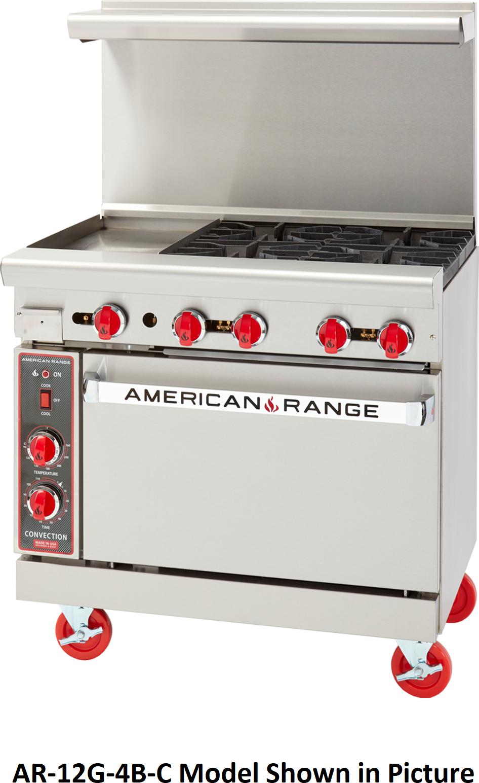American Range, restaurant range size 48" x 32-1/2" x 56" Stainless steel front, sides, backriser, shelf and 6" adjustable legs. Removable full width drip pan. Choose 32,000 BTU/hr. open burners with lift-off burner heads or 20,000 BTU/12" section griddle or a combo burner griddle. Heavy-duty cast iron grates, 12" x 12". Burner knobs are cool to the touch, high temperature material. Two ovens: 27,000 BTU/hr. standard oven, with porcelain interior and inside door panel, oven interior measures 20"W x 26-1/2"D x 13-1/2"H. Oven thermostat adjusts from 250°F to 500°F. Ovens supplied with two racks. Oven door with a spring assisted, counterweight mechanism requiring no adjustment. Rear gas connection and pressure regulator.