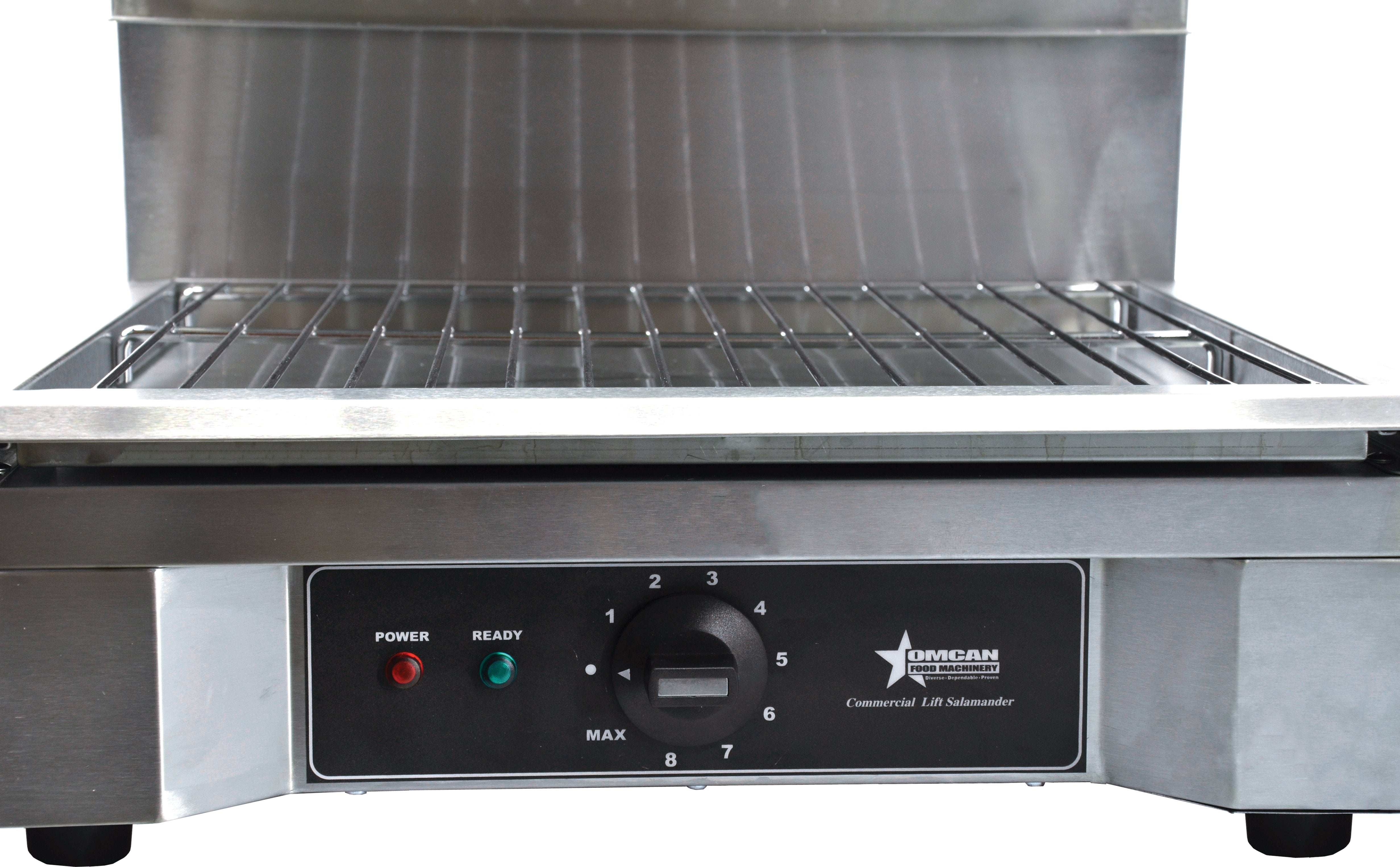 This adjustable salamander has a quick quartz heating from the top and adjustable top grill for quick cooking with minimal heat loss.