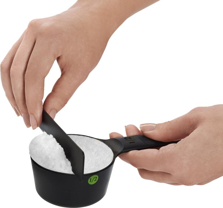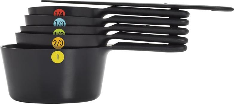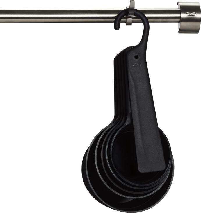 Cups snap together for compact storage. They also feature a hook for hanging cups and also doubles as a swiper to level ingredients for more accurate measuring. Soft, non-slip handles have permanent brightly colored measurement markings making it easy to find the right measurements. Each cup features a half-way measurement marking. Set includes: Hook/Swiper, 1 Cup/ 250 ml, 2/3 Cup/ 158 ml, 1/2 Cup/ 125 ml, 1/3 Cup/ 79 ml, 1/4 Cup/ 59 ml. Dishwasher safe.
