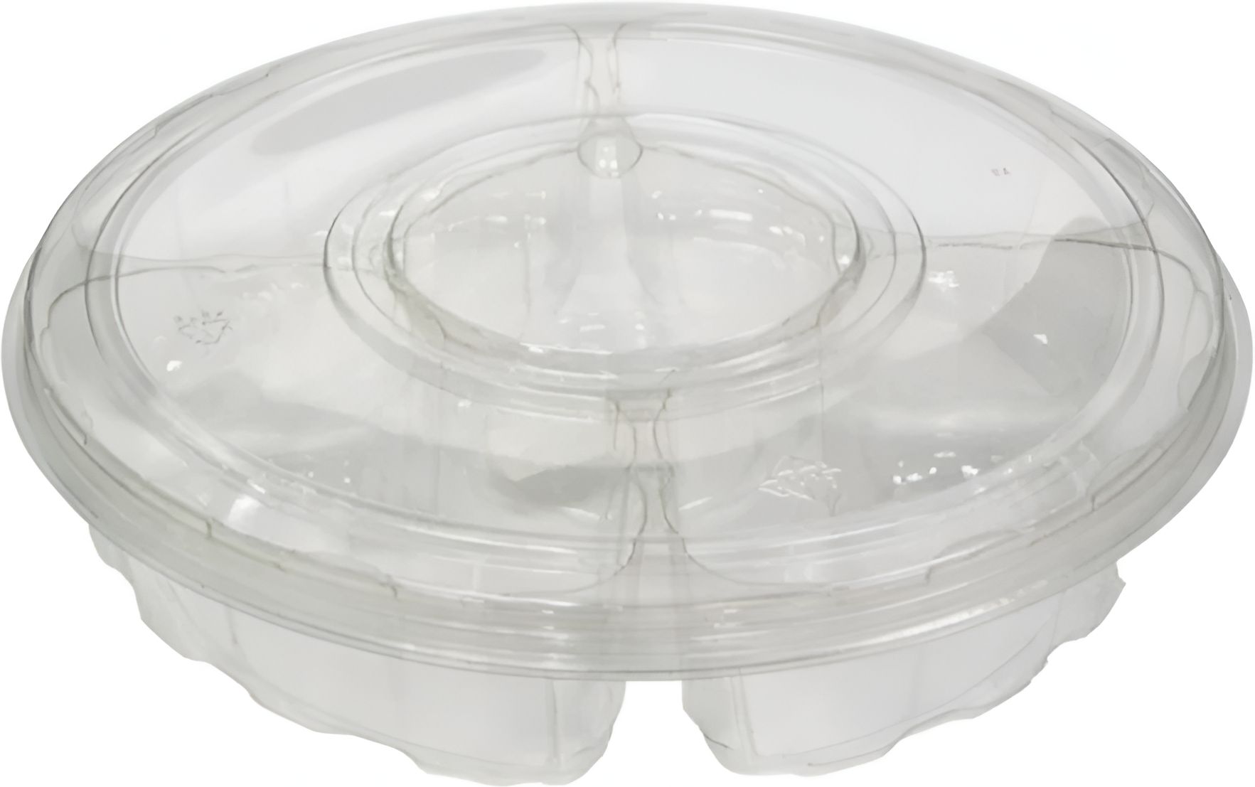 Pactiv Evergreen 10.25" Plastic 4 Compartment Platter, a versatile and practical solution for your catering and entertaining needs. Brought to you by Pactiv Evergreen, a reputable name in the industry, these platters are designed with precision and functionality in mind. Each case contains 120 plastic 4 compartment platters, providing you with a generous supply for serving a variety of appetizers, snacks, or party platters. The 10.25-inch size offers ample space for creative presentations, making these platters ideal for events ranging from casual gatherings to formal occasions. The innovative design of these platters features four compartments, allowing you to showcase a diverse selection of food items without the risk of flavors mingling. Whether you're serving an assortment of dips, vegetables, cheeses, or other bite-sized treats, these compartments help maintain the integrity of each item, enhancing the overall dining experience.