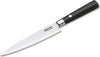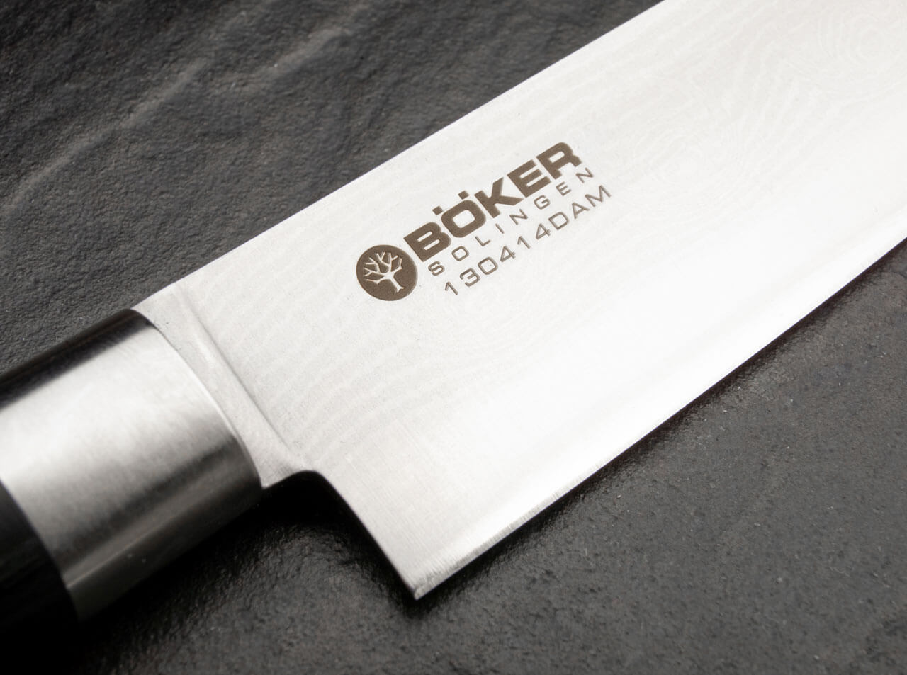 The Boker Damascus Black Kitchen Knife line combines traditionally-Japanese handles made of black Plywood with razor-sharp blades made of stainless Damascus with 37 layers of steel, characterized by a beautiful grain. The extremely high-impact core of the Damascus blade consists of the high-performance VG-10 steel. The noticeable sharpness when cutting is breathtaking and makes cooking an experience. The Japanese design of the knife handle with the matted stainless steel clamps gives the line its special character.