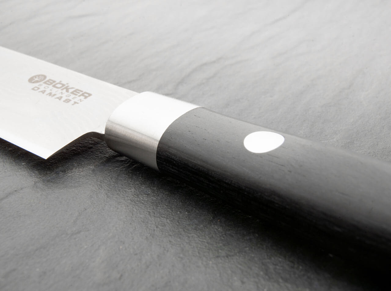 The secret of this unusual sharpness lies in the material and its processing. The blade consists of 37 layers of Damascus steel. The stainless premium blade steel VG-10 used for the center layer is made in Japan and offers hardness, resilience and a homogeneous crystalline structure. In direct cooking performance comparison with a product made by an established Solingen kitchen knife manufacturer in accordance with DIN EN ISO 8442-5, the kitchen knife line Boker Damascus Black is literally a cut above. The representative DIN test showed that the cutting performance of our knives was 68% better than that of the competitor's product. The knives also score points with their higher level of initial sharpness. Thus, constant sharpening is a thing of the past.