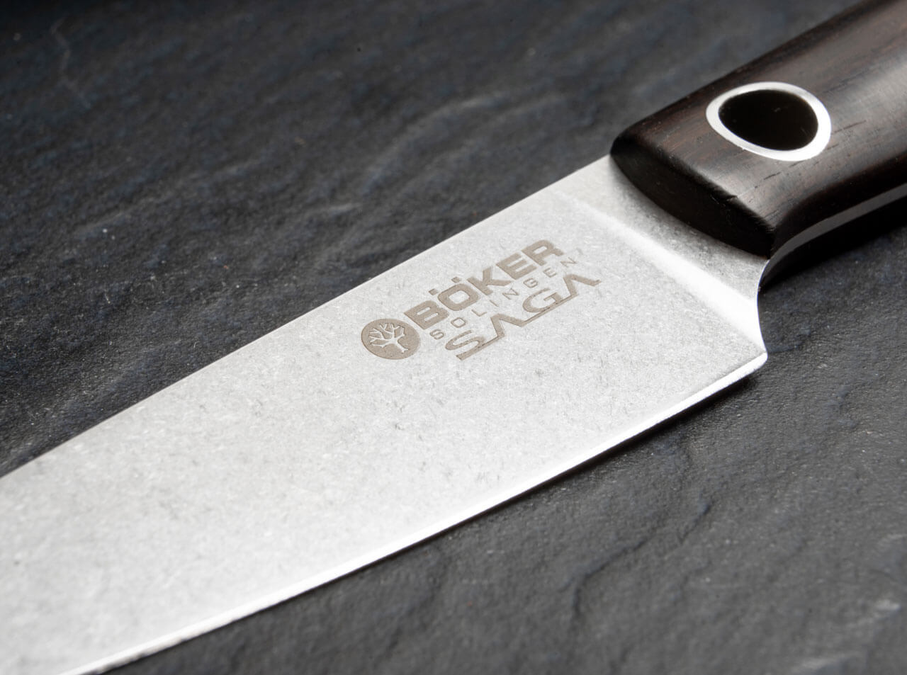 Boker Saga owes its high strength to the full-tang design, which extends over the full length of the knife (in the same manner as on many hunting knives) from the blade tip to the pommel. The optimized cutting performance is not only guaranteed by the full flat grind of the blade with stonewash finish, but also by selecting 440C as the blade steel, which far surpasses the edge-holding and corrosion-resistance of conventional chef's knife steels. This surface finish is achieved in a specialized grinding process and is characterized by outstanding gliding properties through the cutting material, thus enhancing the already superior cutting performance. In addition, the micro-structure of the stonewash finish is extremely scratch-resistant, since these are typically visually absorbed by the texture. A special note is achieved by the large hollow rivets, the unmistakable mark of Jesper Voxaes. The Paring Knife is particularly handy and has a short blade. All smaller works in the kitchen are carried out with this Knife. The main task, as the name implies, is the paring of fruit and vegetables. It is perfectly suited for cutting along the skin.