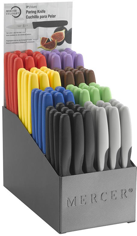 The Mercer Millennia Colors 10" x 5.37" x 13" Polypropylene 8 Compartment Multicolor Paring Knife Display with Japanese Knife, a sophisticated solution for showcasing and organizing your kitchen essentials. Crafted with precision and practicality in mind, this display is meticulously designed to enhance your culinary experience. Constructed with epoxy-coated, heavy-gauge steel, this display guarantees durability, ensuring it withstands the rigors of everyday use. Its tiered design not only facilitates easy access to knives but also offers a clear sight of handle colors, allowing for quick identification and selection. Say goodbye to rummaging through drawers or cluttered countertops – with this display, efficiency is at your fingertips. Additionally, the display features a two-sided header card, providing information in both Spanish/English and French/English, catering to a diverse range of users. Whether you're a seasoned chef or a passionate home cook, this display elevates your kitchen organization to new heights. Experience the perfect blend of functionality and aesthetics with the Mercer Millennia Colors Paring Knife Display. Embrace convenience, efficiency, and style in your culinary endeavors.