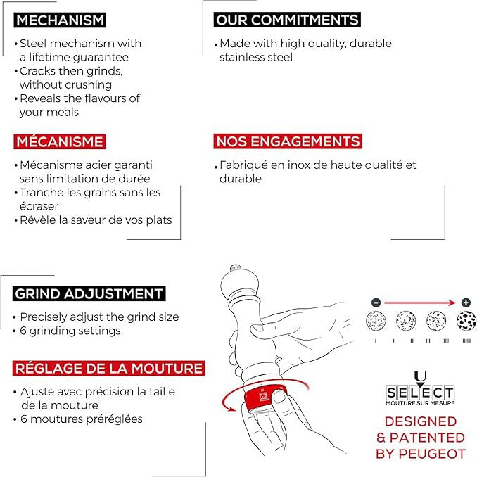 Peugeot is shipped free across Canada on orders over $149. Since 1840 in the heart of Doubs in France, Peugeot has been manufacturing world renowned salt and pepper mills, and their patented u'Select grind adjustment system is unlike any other on the market. Find the right model for you with other 180 to choose from!