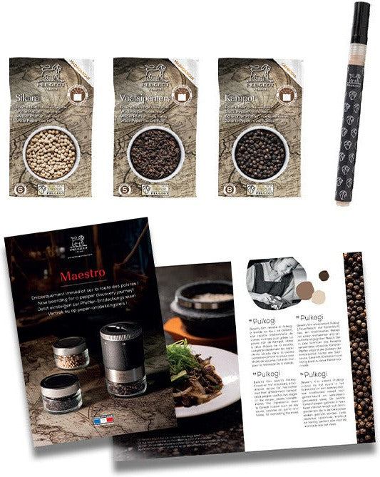 The Peugeot Maestro Pepper Bar Set embodies the pinnacle of precision engineering and culinary exploration. This French-made gift set introduces the Maestro pepper mill, an exquisite instrument designed to elevate the art of seasoning. The set comes complete with interchangeable jars, encouraging adventurous souls to explore a diverse range of spice varieties. With three premium peppers included—Kampot black pepper, Sikara white pepper, and Voatsiperifery wild pepper—the stage is set for a journey of discovery into the fascinating world of flavor.