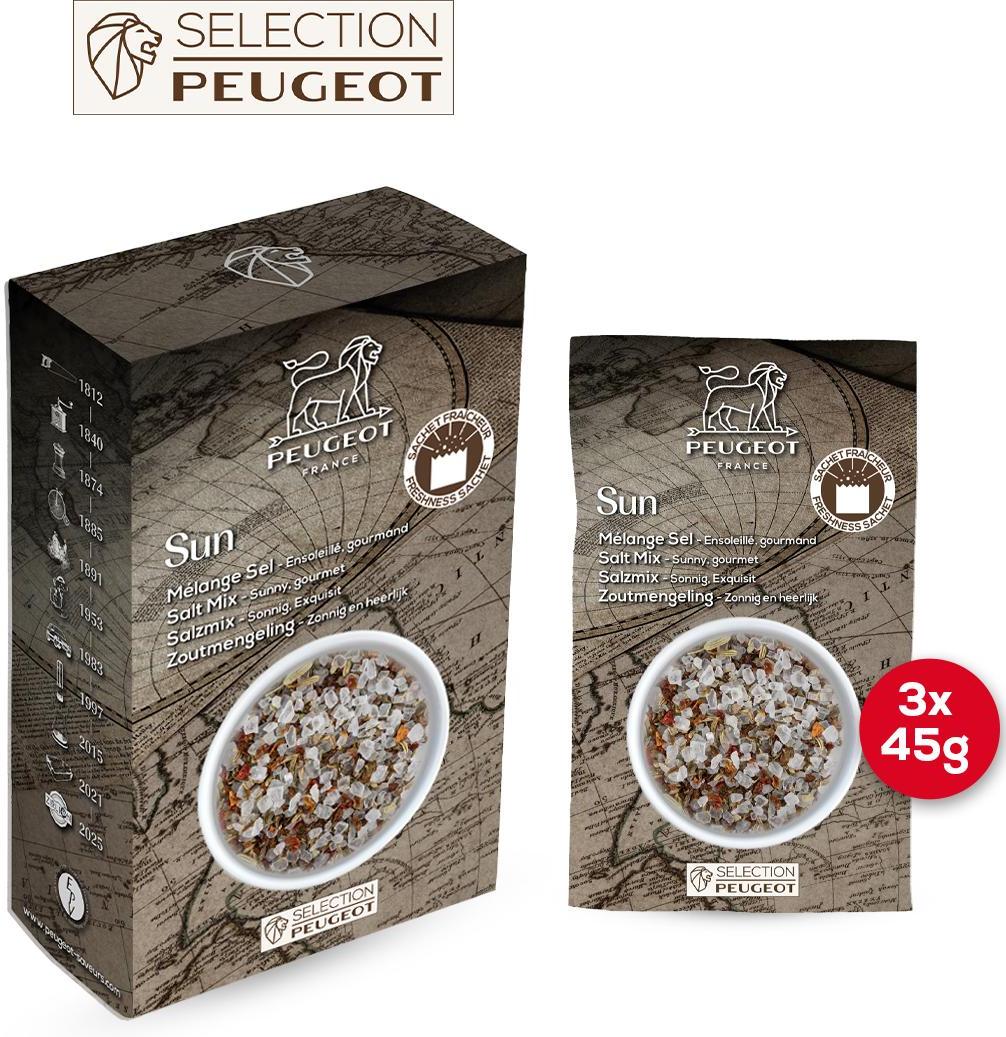 Add vibrant Mediterranean flavor to your meals with the Peugeot Sun Salt Blend—a gourmet fusion of rock salt, aromatic herbs, spices, and dried summer vegetables. Each 45g sachet delivers a burst of flavor featuring fennel’s freshness, cumin’s earthy depth, and the sweet warmth of sun-dried tomatoes and peppers. Designed for use with Peugeot Zeli or ZIRLION mechanisms, this blend offers versatility in both flavor and texture when you adjust the grind size. Each sachet is triple-protected against air, light, and moisture to preserve freshness, making it a convenient, eco-conscious choice for everyday gourmet cooking.