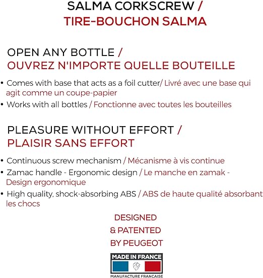 - CONTINUOUS TURN CORKSCREW — Maximize memorable moments with minimum effort. The Peugeot Salma Continuous Turn Corkscrew is an intuitive bottle opener that allows you to easily de-cork wine bottles. Designed in France