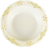 This Fineline 5901-BOG Heritage 10 oz. bone / ivory plastic bowl is sure to illuminate any tabletop presentation. Made of polystyrene plastic, this strong, and sturdy bowl is perfect for wedding receptions and luncheons. While its 10 oz. capacity makes it great for serving soups, salads, and sides of pasta, its scalloped edge and intricate, gold detailing beautifully frame each dish and add a classic, vintage touch to table settings.