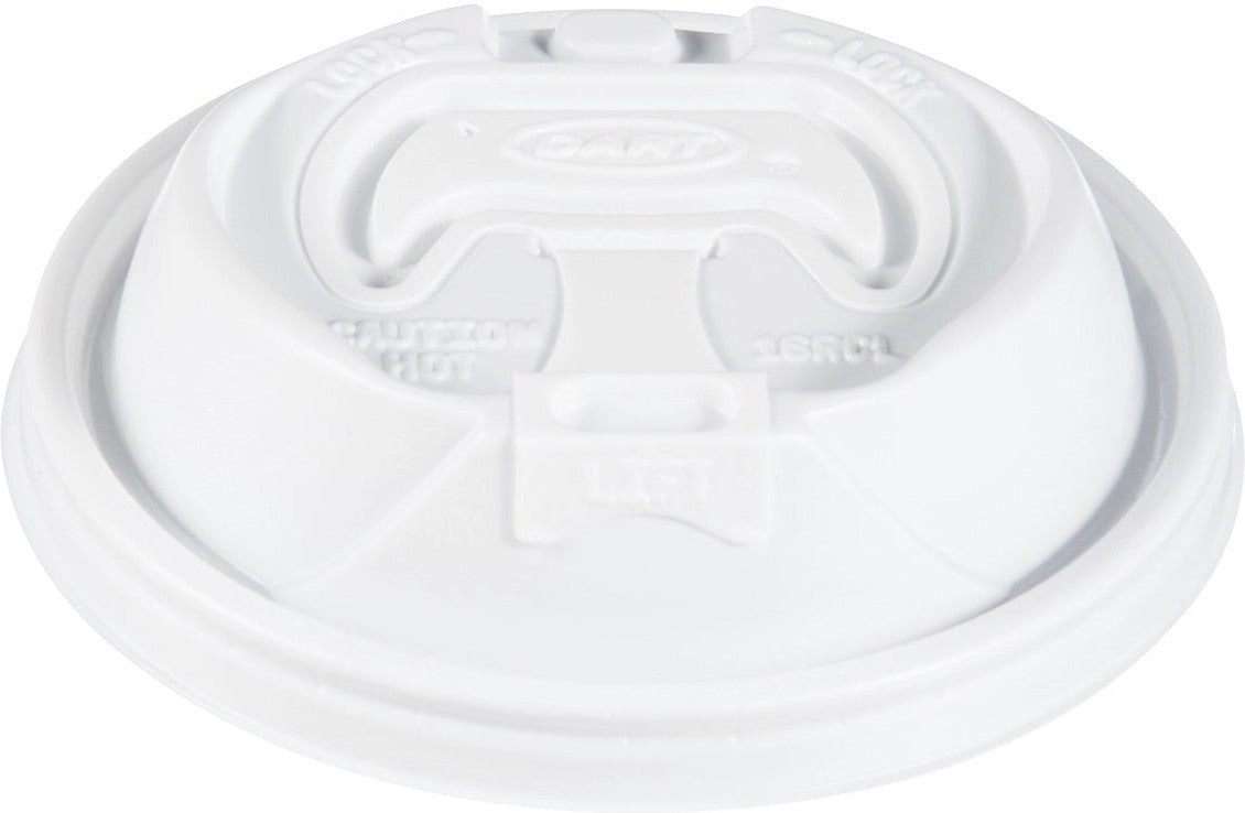 With its white color, the lid provides a clean and professional appearance, enhancing the overall presentation of your beverages. It complements a variety of cup styles and settings, making it suitable for various foodservice establishments. The Dart Container 12 oz Lift & Lock Travel Lid is designed with convenience in mind. It is easy to use—simply lift the tab and lock it into place to create a secure seal. When it's time to enjoy the beverage, the lid can be easily lifted, allowing for effortless sipping.