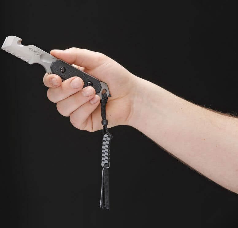 The 440C stainless steel blade of the rescue tool is bead blasted. The handle scales are made of non-slip G10 to guarantee perfect grip even when wearing gloves or in wet conditions. Includes a high-quality sheath and lanyard.