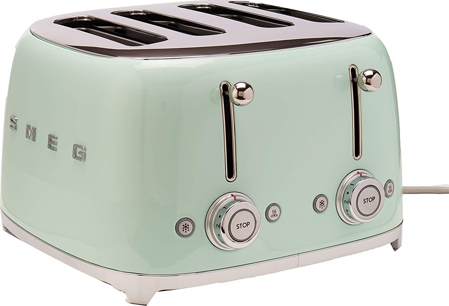 The Smeg 4 Slot Toaster's beautiful powder-coated exterior recalls the bright and cheerful style of 50s design. Engineered to reheat, defrost, and, of course, toast perfectly, this very modern toaster functions with the latest technology and features 6 browning levels. The powder-coated steel body has polished chrome and stainless steel controls and accents.