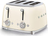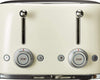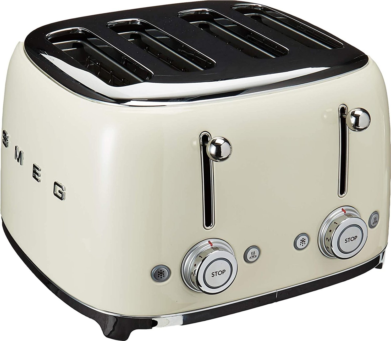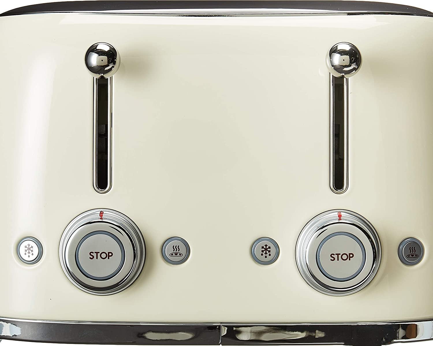 The Smeg 4 Slot Toaster's beautiful powder-coated exterior recalls the bright and cheerful style of 50s design. Engineered to reheat, defrost, and, of course, toast perfectly, this very modern toaster functions with the latest technology and features 6 browning levels. The powder-coated steel body has polished chrome and stainless steel controls and accents.