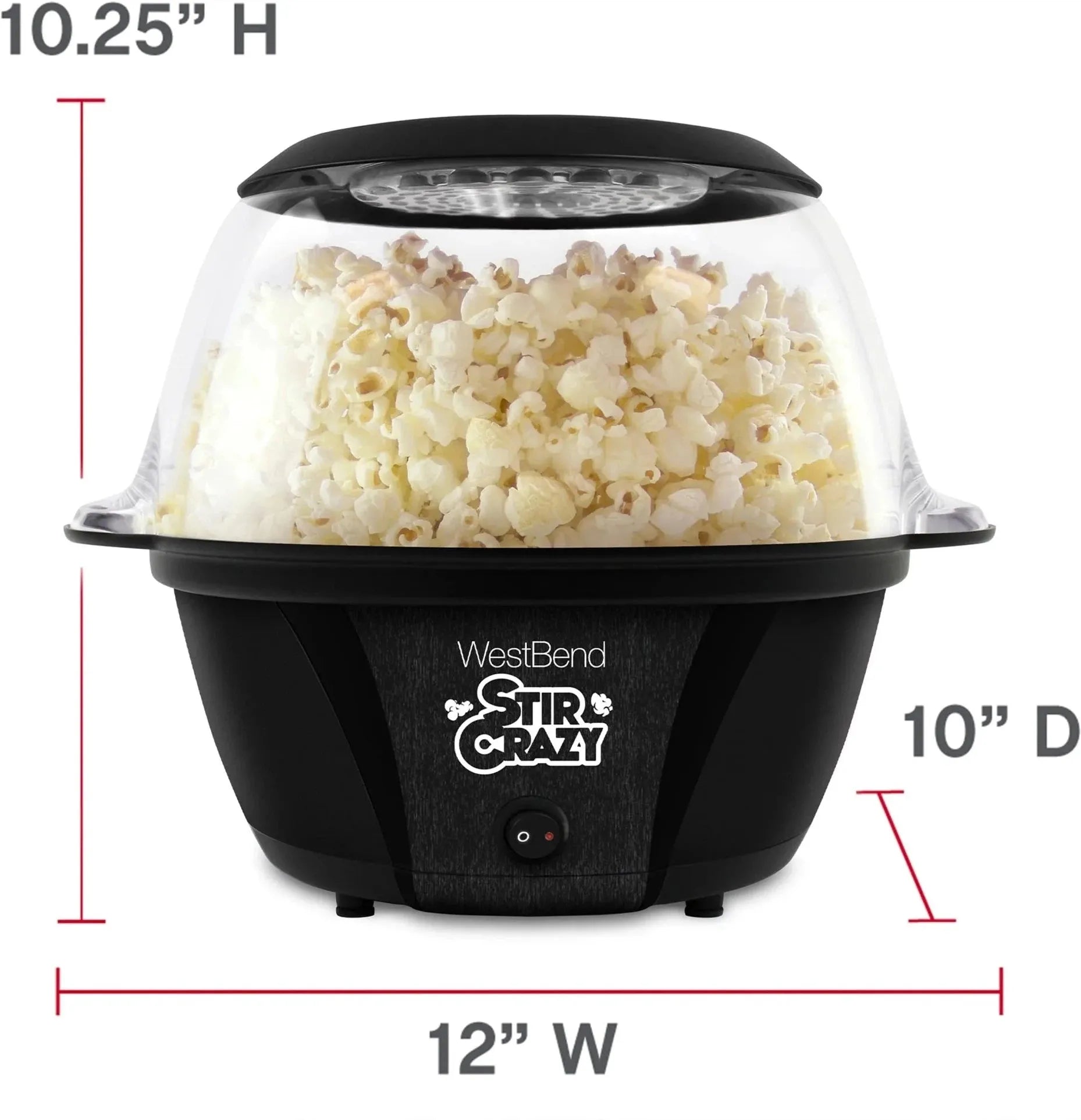 With the West Bend 6Qt. Stir Crazy Stirring Popcorn Machine you can quickly whip up a batch of delicious, hot, fluffy oil-popped, stirred popcorn. Now you can have traditional, move-theater popcorn taste in your home with the stir rod technology that keeps kernels moving to prevent any burning. The butter melting well in the cover butters popcorn as it pops. Then use the snap on cap when you use the cover as a serving bowl. The ventilation vents release moisture ensuring great-tasting, crunchy popcorn. When popping is done clean up is a breeze with the non-stick surface and dishwasher-safe cover and butter lid. A simple on and off button makes operation a breeze. The space saving design offers onboard cord wrap and nesting storage. With four quarts (24-cups) per batch, you’ll look forward to serving this traditional treat for everyday snacking, at-home movie nights or for any fun occasion.