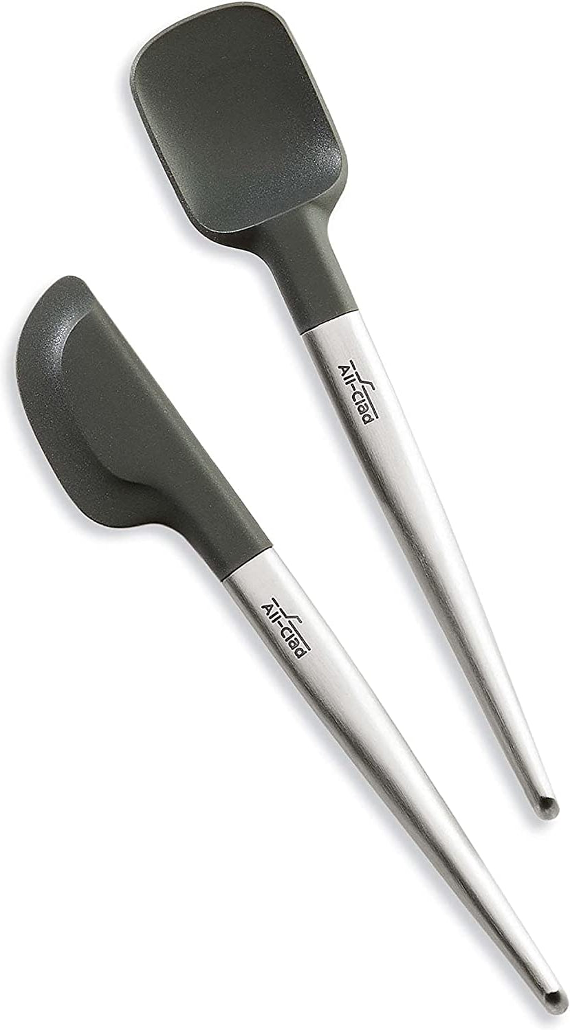 Mix, fold, spread, and scrape without worry with these durable, sleek Silicone Tools. This set includes a mini spoonula and a mini scraper, perfect for folding small batches or reaching into small jars. The dual-grip stainless steel handle allows for excellent leverage, while the platinum silicone head is firm enough to scrape but can flex easily to reach into corners. Safe for use with nonstick cookware and bakeware, with heat up to 450°F, and for cleaning in the dishwasher, these tools are just as durable as they are convenient.