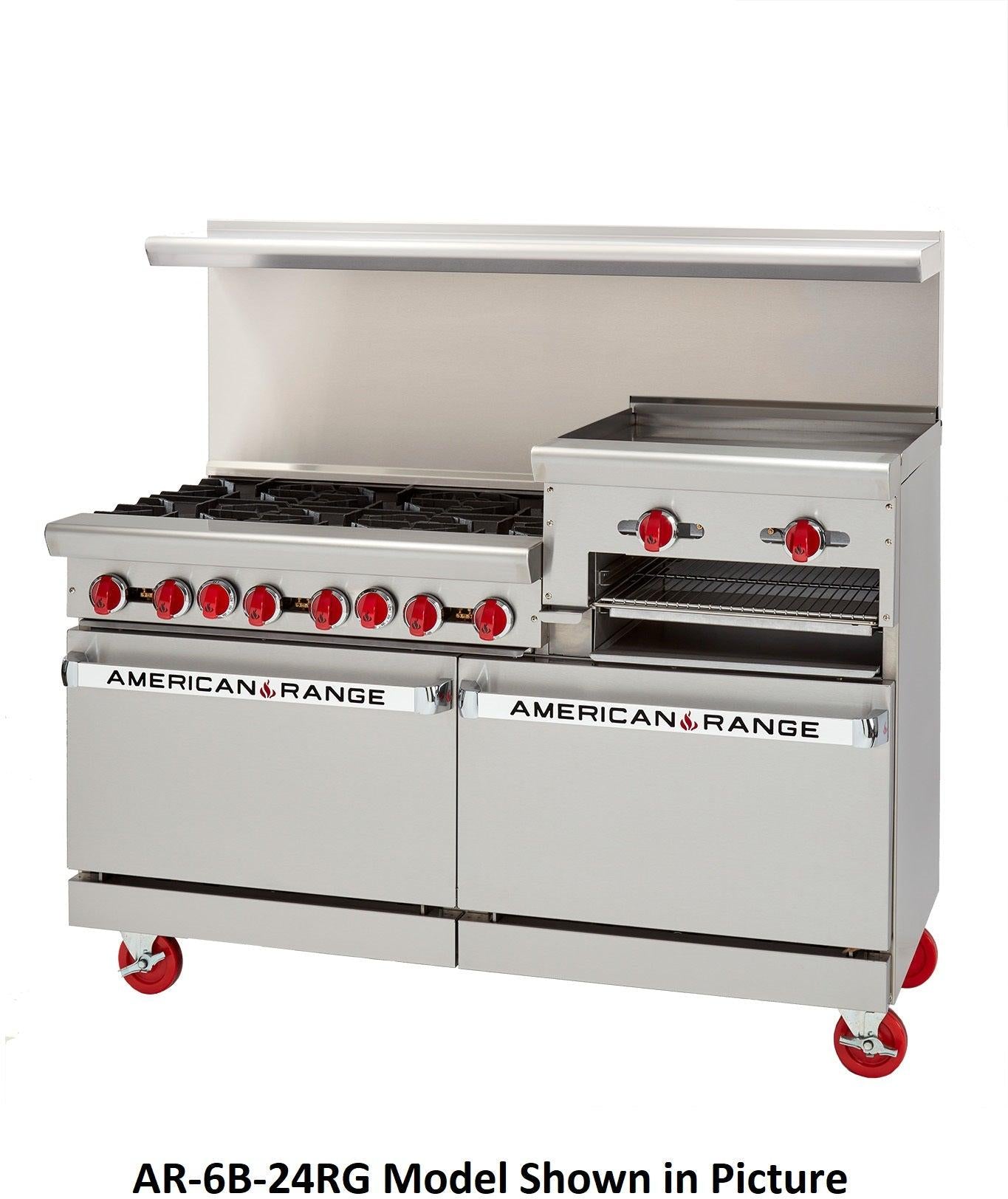 American Range, restaurant range size 72" x 32-1/2" x 56" Stainless steel front, sides, backriser, shelf and 6" adjustable legs. Removable full width drip pan. Choose a combo 32,000 BTU/hr. open burners with no-clog lift-off burner heads along with 20,000 BTU/hr. per 12" section raised griddle with 3/4" plate. Heavy-duty cast iron grates, 12" x 12". Burner knobs are cool to the touch, high temperature material. Two ovens: 35,000 BTU/hr. standard oven, 30,000 BTU/hr. for convection or innovection with porcelain interior and inside door panel, oven interior measures 26-1/2"W x 22-1/2"D x 13-1/2"H.