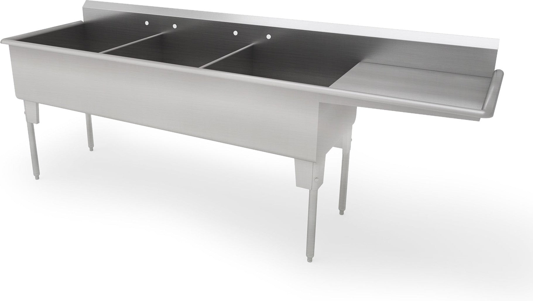 In summary, the Franesse 24" x 20" x 14" Triple Compartment Sink with Drainboard is a dependable and efficient solution for maintaining cleanliness and productivity in your commercial kitchen. Its triple compartment design, built-in drainboard, and durable construction make it ideal for a range of food preparation and dishwashing tasks, ensuring that your kitchen operations run smoothly and efficiently.