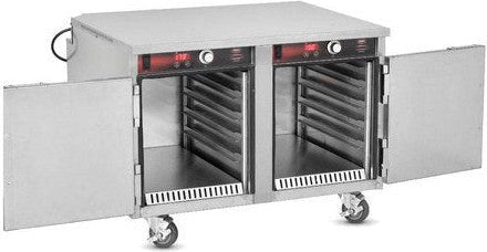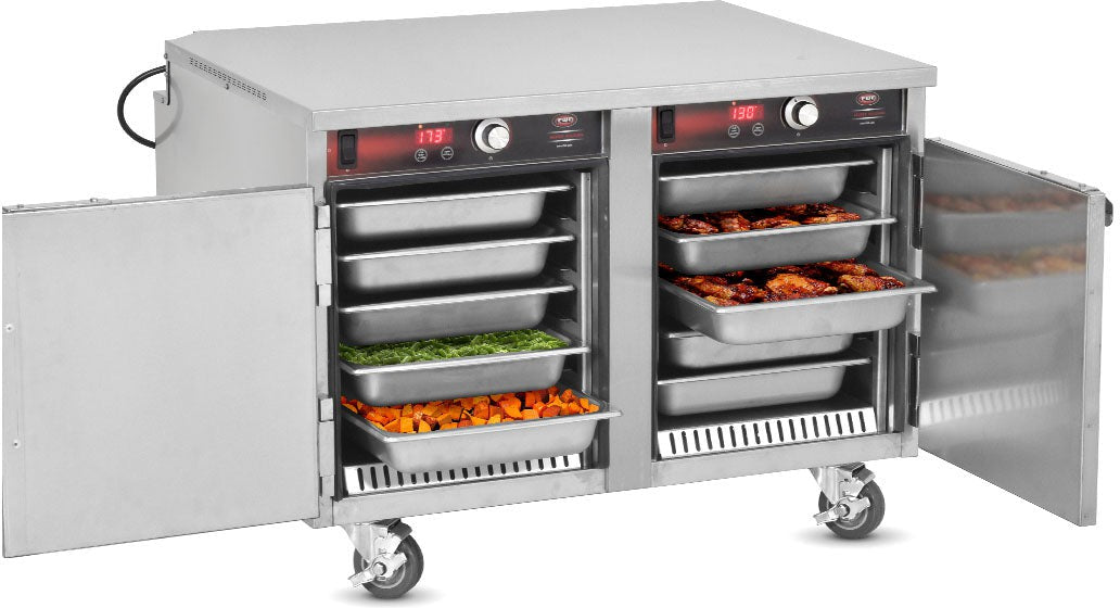 Dual Solid Stainless Steel: Doors Equipped with two solid stainless steel doors, this cabinet ensures that heat remains locked inside, maintaining the temperature even when accessing different sections of the unit. The double-door design allows for easier organization and selective access, so kitchen staff can retrieve specific pans without losing heat from the entire cabinet. The solid doors also contribute to the unit's durability and heat efficiency.