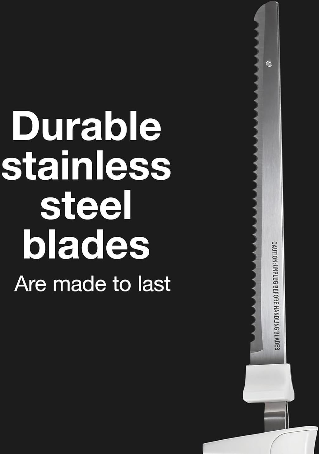 • Stainless Steel Reciprocating Blades: The 7-inch serrated blades are made of durable stainless steel, providing precise and even cuts through various foods, including meats and breads.