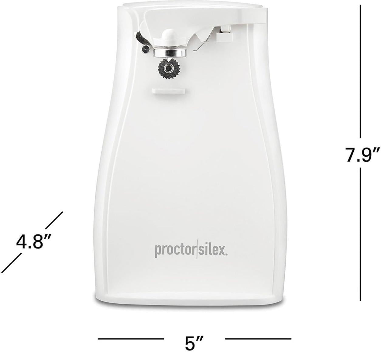 The Proctor Silex Power Opener™ Electric Can Opener is a compact and efficient kitchen appliance designed to simplify the process of opening cans. Its user-friendly features and space-saving design make it a valuable addition to any kitchen.