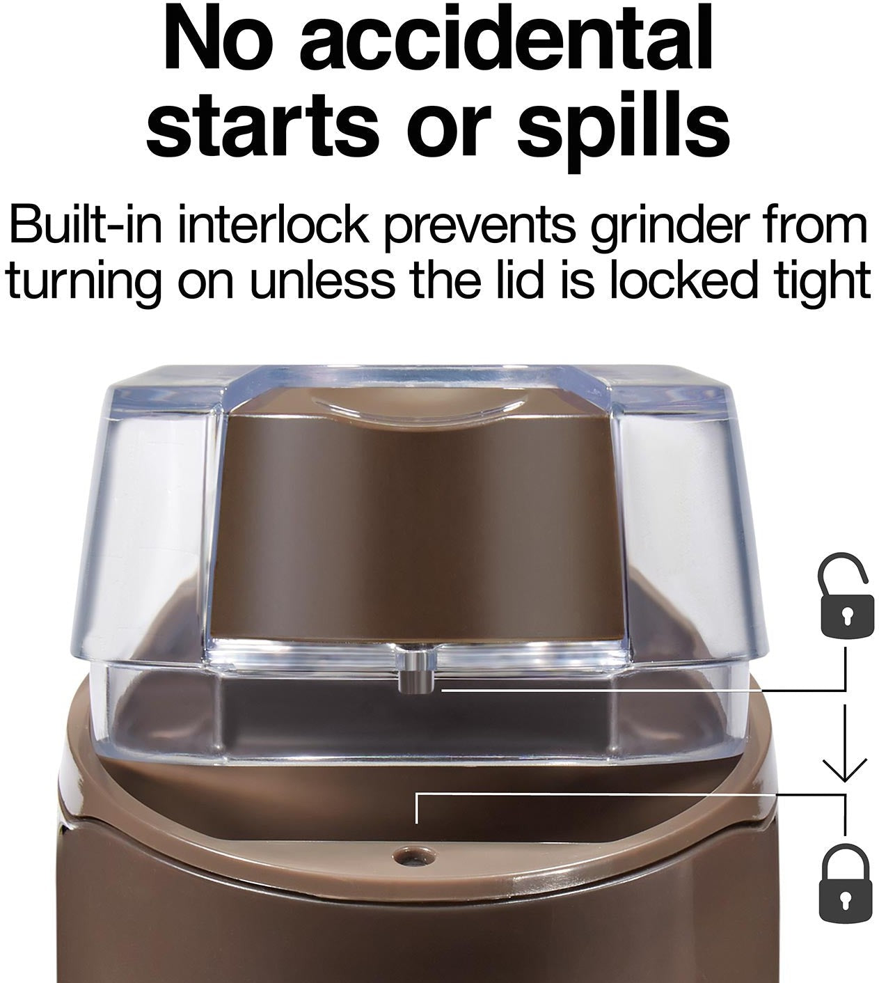 • Built-in Safety Feature: The grinder includes an interlock mechanism that prevents it from turning on unless the lid is securely locked in place, ensuring safe and hassle-free operation.
