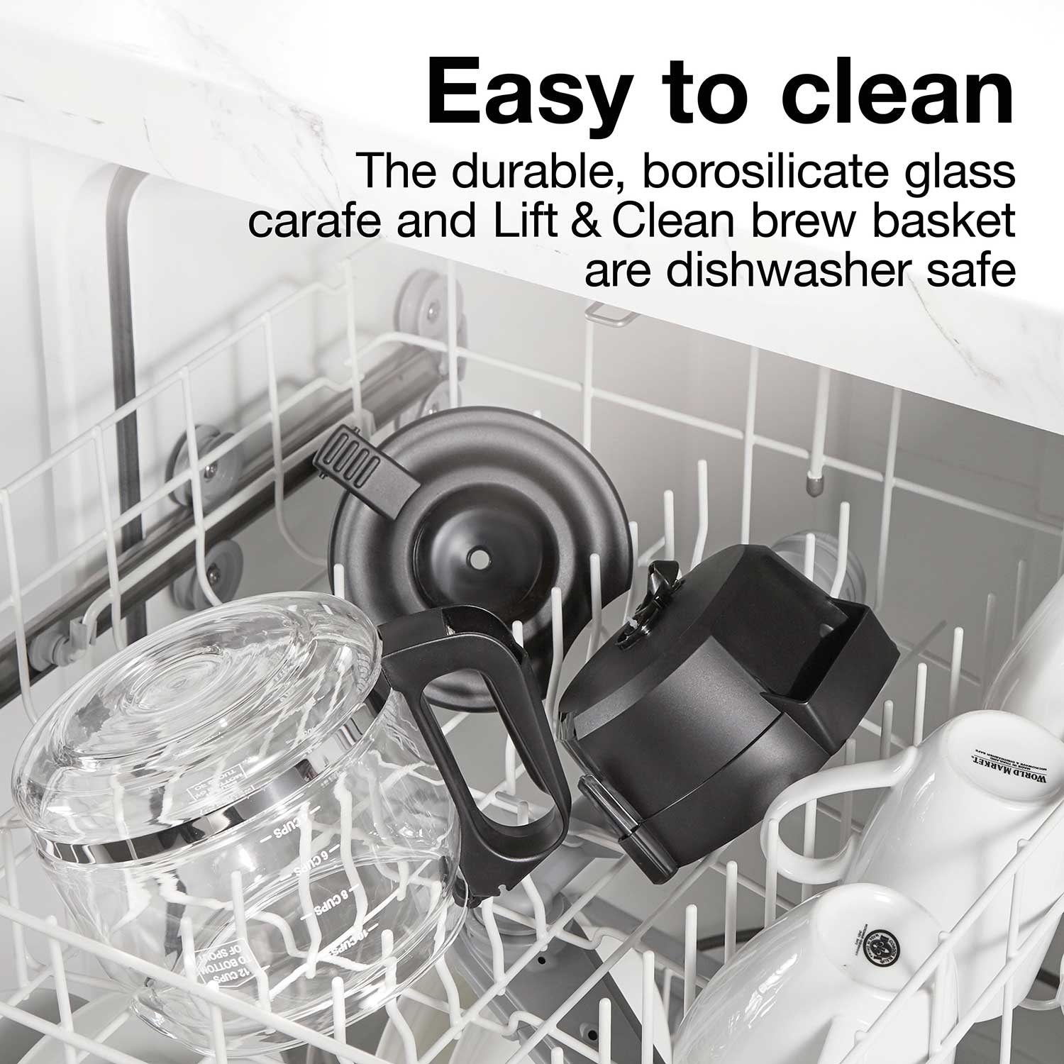- Dishwasher Safe Components: The durable borosilicate glass carafe and Lift & Clean brew basket are dishwasher safe, simplifying cleanup.