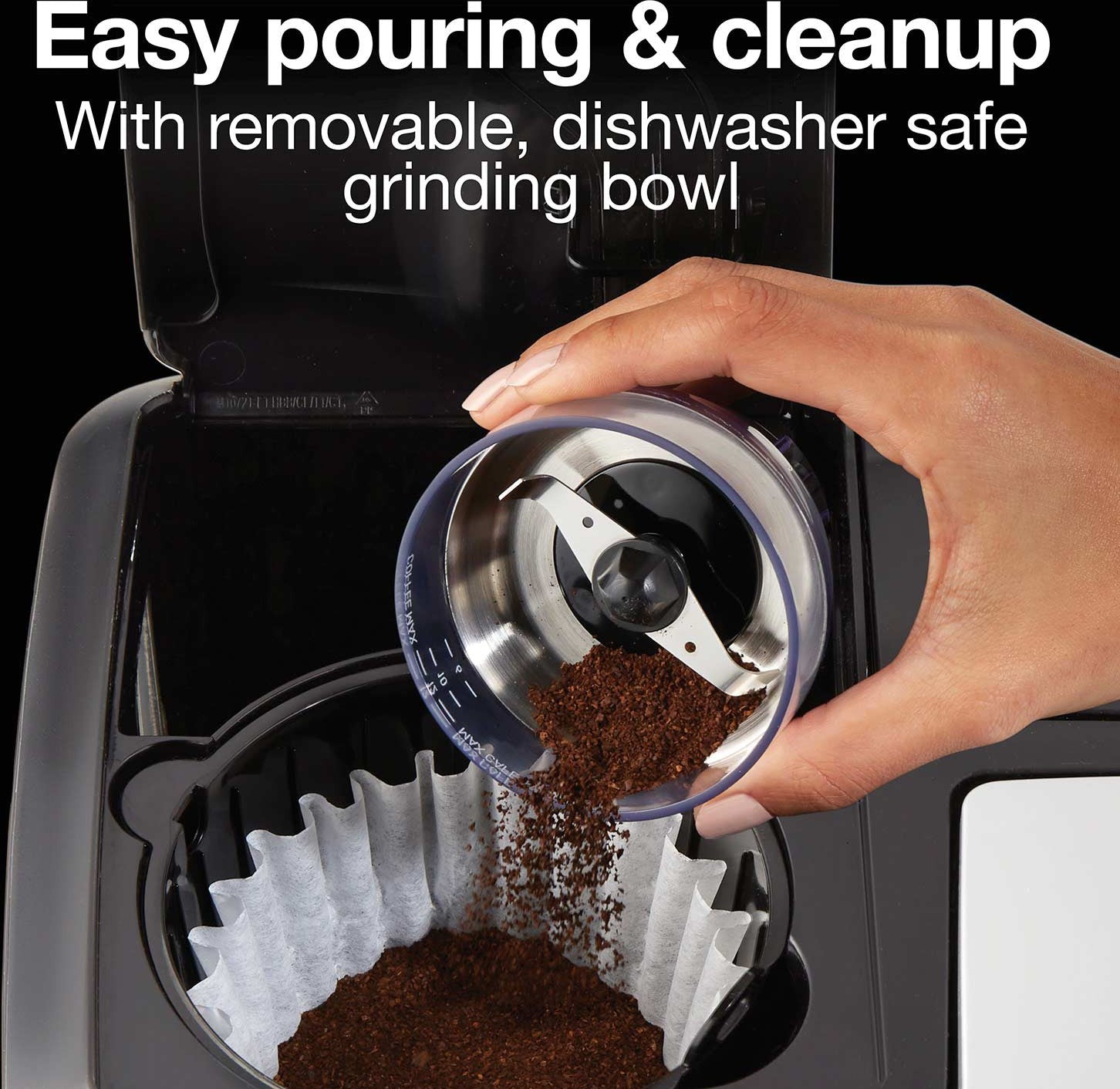 - Removable Bowl: The grinding bowl is dishwasher safe and easily removable for filling with coffee beans and pouring out ground coffee, ensuring effortless cleanup.