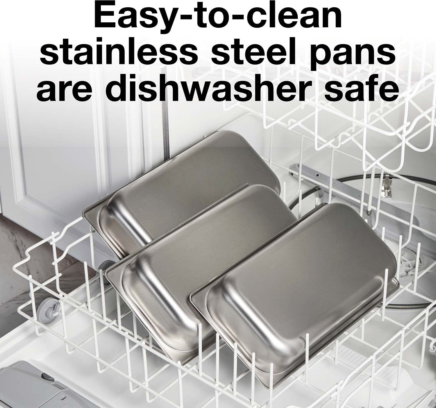 - Dishwasher Safe: The stainless steel pans are dishwasher safe for easy cleanup after use, while the domed lids can be wiped clean or rinsed in the sink.
