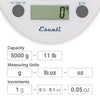 Our scale offers precise measurements with a capacity of 11 lb (5,000 g) and increments of 0.05 oz (1 g). It supports multiple units: oz, lb:oz, g. Battery operated (two AA batteries included) for convenience. Dimensions: 8.5 x 6 x 1.5 in.