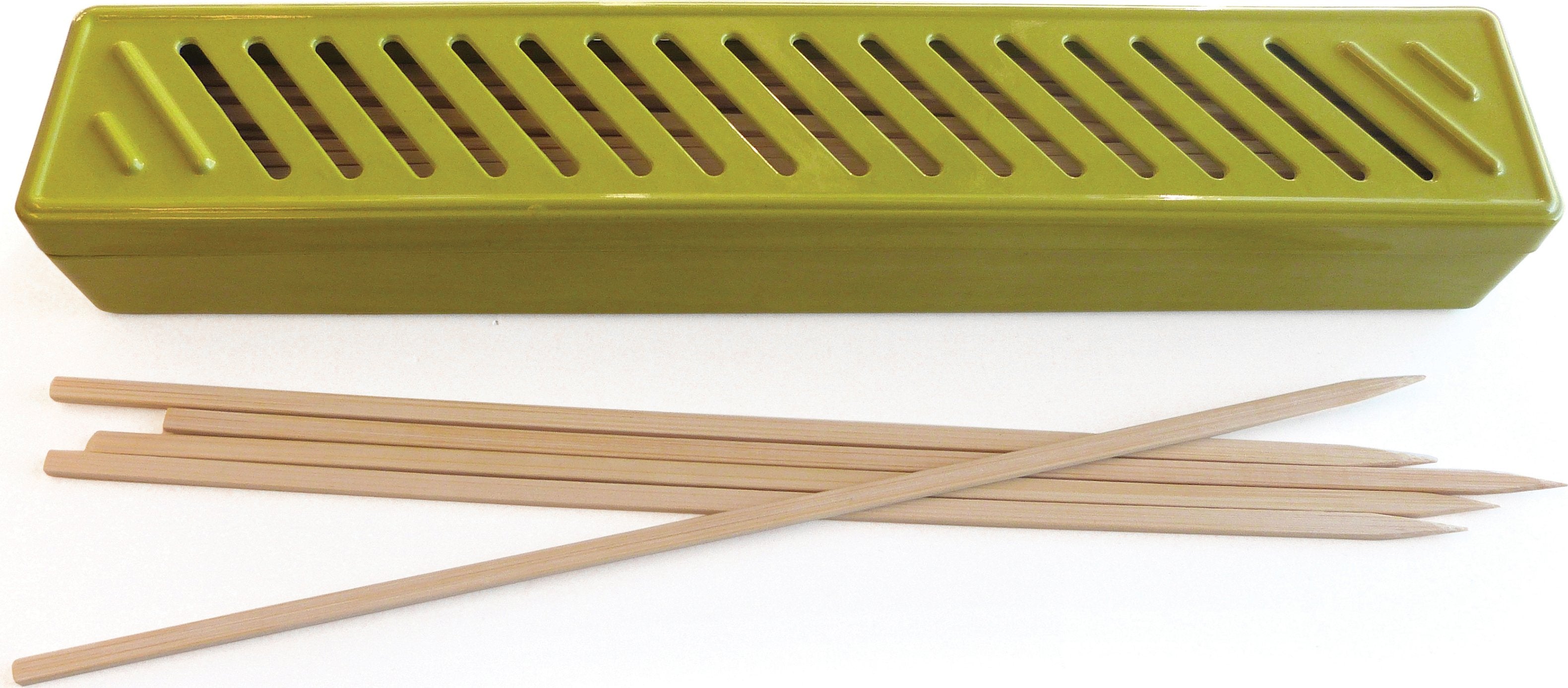 Pre-soak wooden skewers for 20-30 minutes in our Bamboo Skewer Box, then simply turn the box upside-down to drain out the water. Dry the box thoroughly and store unused skewers neatly and conveniently. Holds up to 50 flat skewers or 100 round skewers up to 12″ long. Made of waterproof, eco-friendly bamboo fibers. Skewers sold separately.