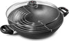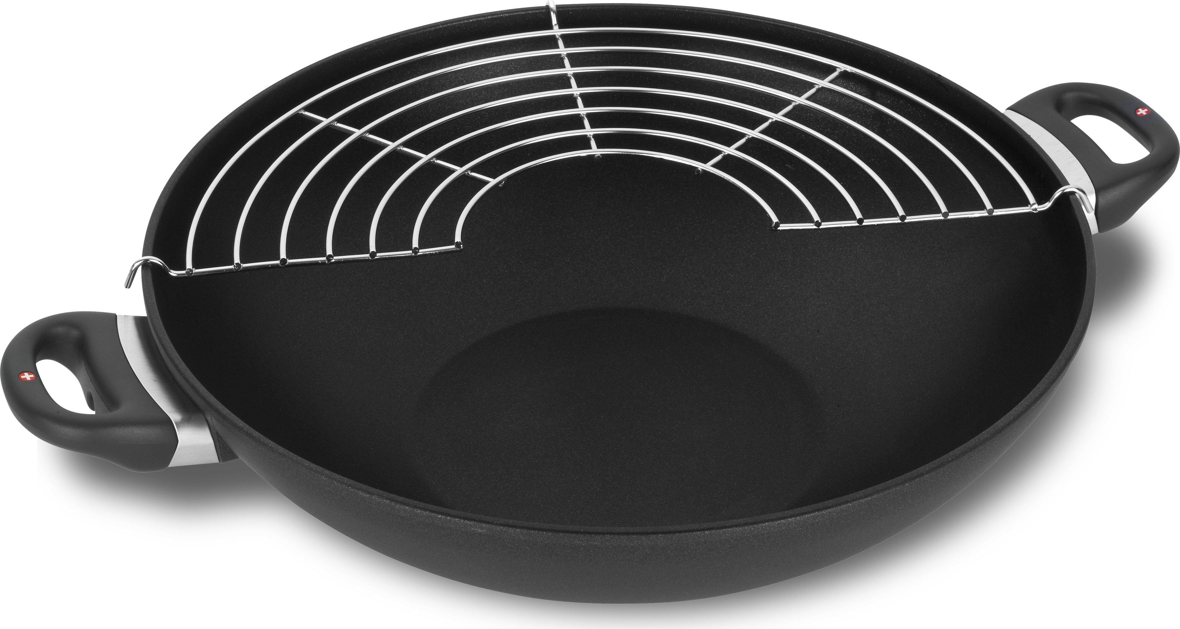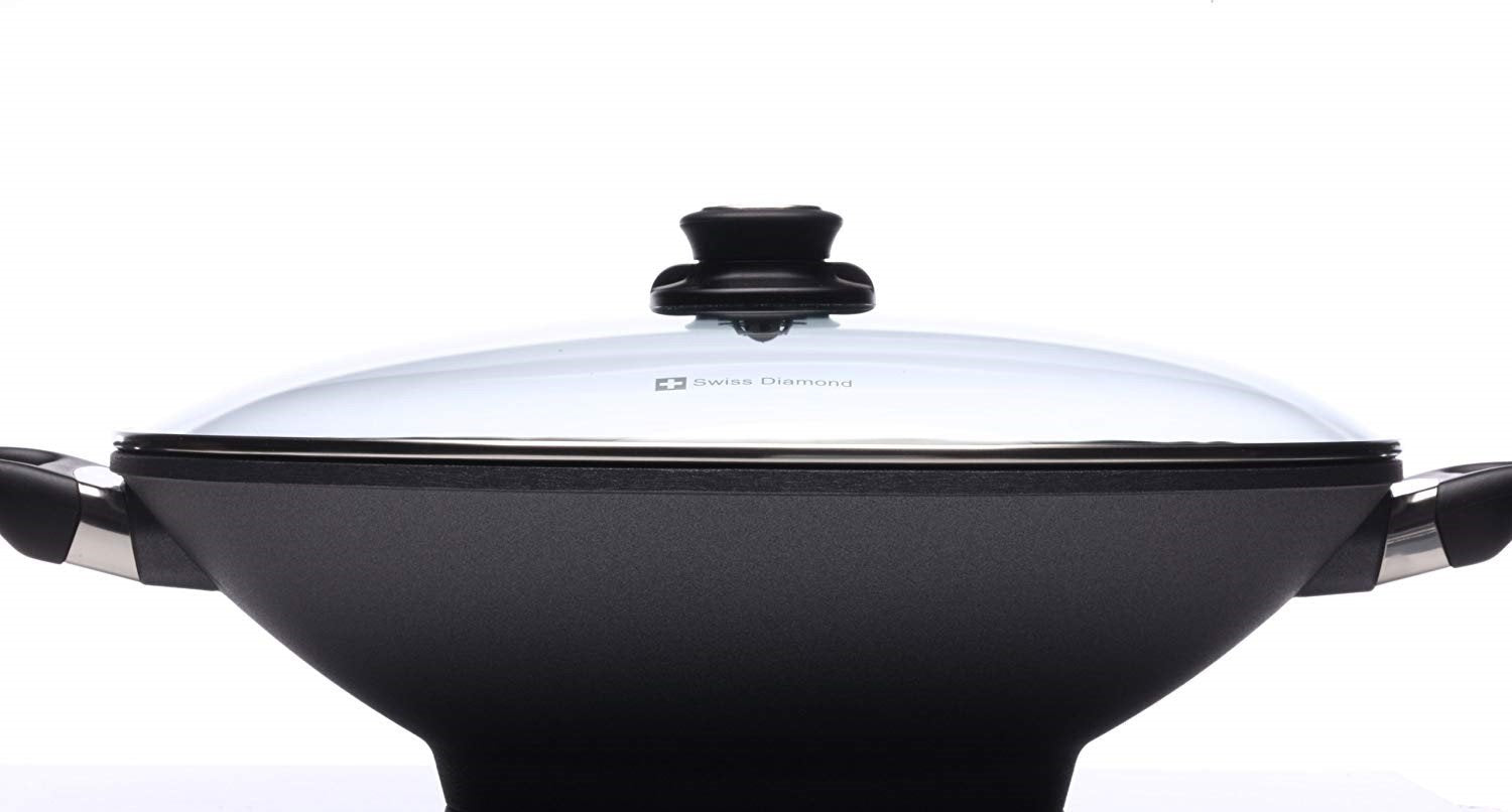 Swiss Diamond's largest wok, this 36 cm (14”) model has two short handles for superior ease of handling. With a flat base, it does not require a wok ring. The nonstick coating, reinforced with real diamond crystals, is ideal for oil-free cooking and cleans up with just hot soapy water. The included tempered glass lid allows you to monitor food without lifting the cover, maintaining flavor and keeping food from drying out. The rotating lid knob opens or closes a steam vent to release or contain moisture as needed. Used by discerning home chefs around the world, Swiss Diamond’s PFOA-free cookware features unsurpassed nonstick performance for healthy cooking and easy clean-up.