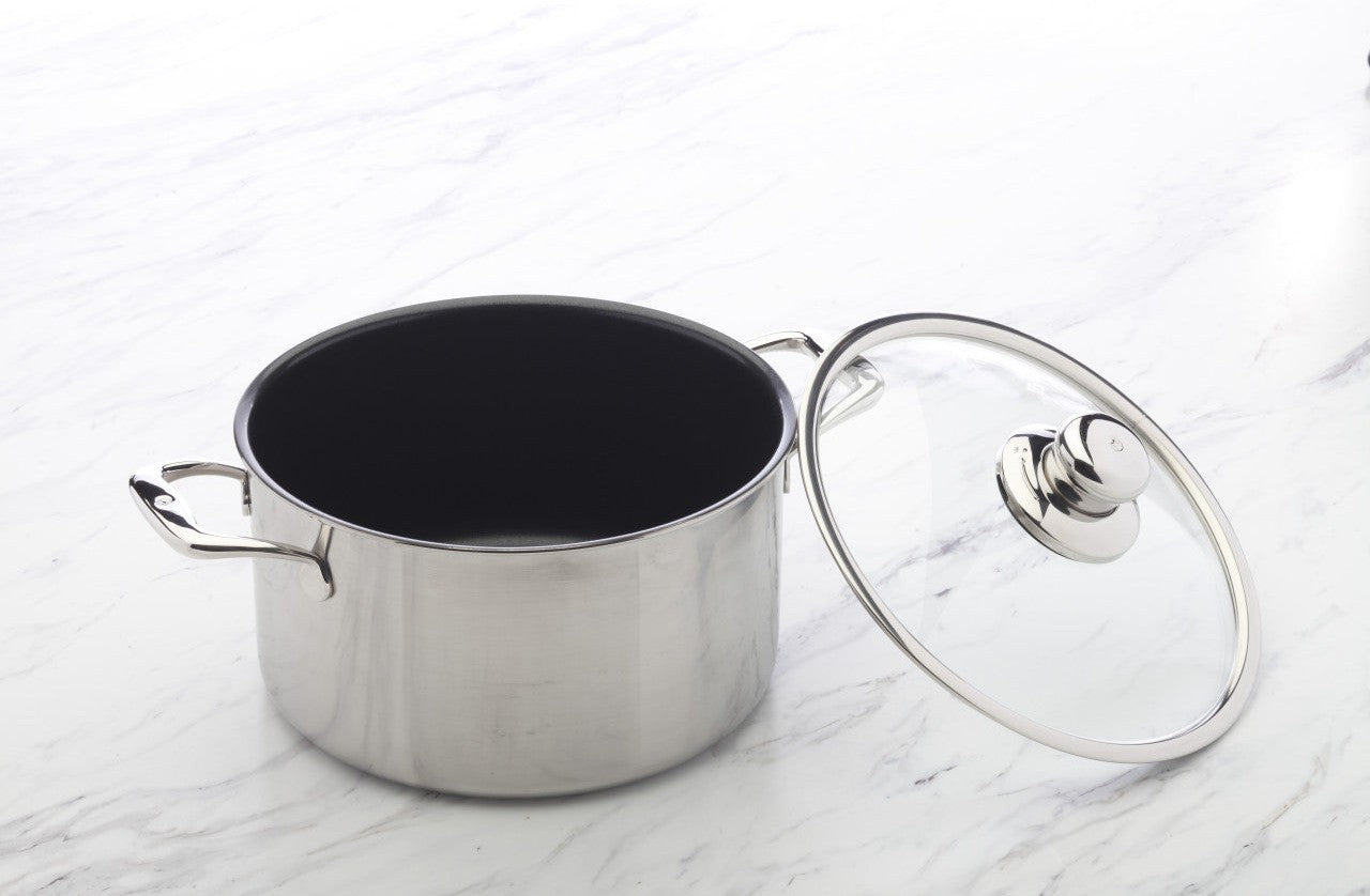 The Nonstick Clad line has a solid foundation built from FIVE LAYERS comprised of an 18/0 magnetic stainless steel base layer, pure and alloy aluminum, finished with an 18/10 stainless steel layer with our Swiss Diamond XD Non-stick Diamond coating, making this the most prestigious line in stainless steel cookware. The Nonstick technology that is incorporated results in brilliant cooking performance and our patented Swiss Diamond nonstick coating results in the perfect food release every time. The bonded layers allow the heat to be evenly distributed around the pan, removing the possibility of hot spots. These high quality products will reduce the amount of energy needed to produce your meals.