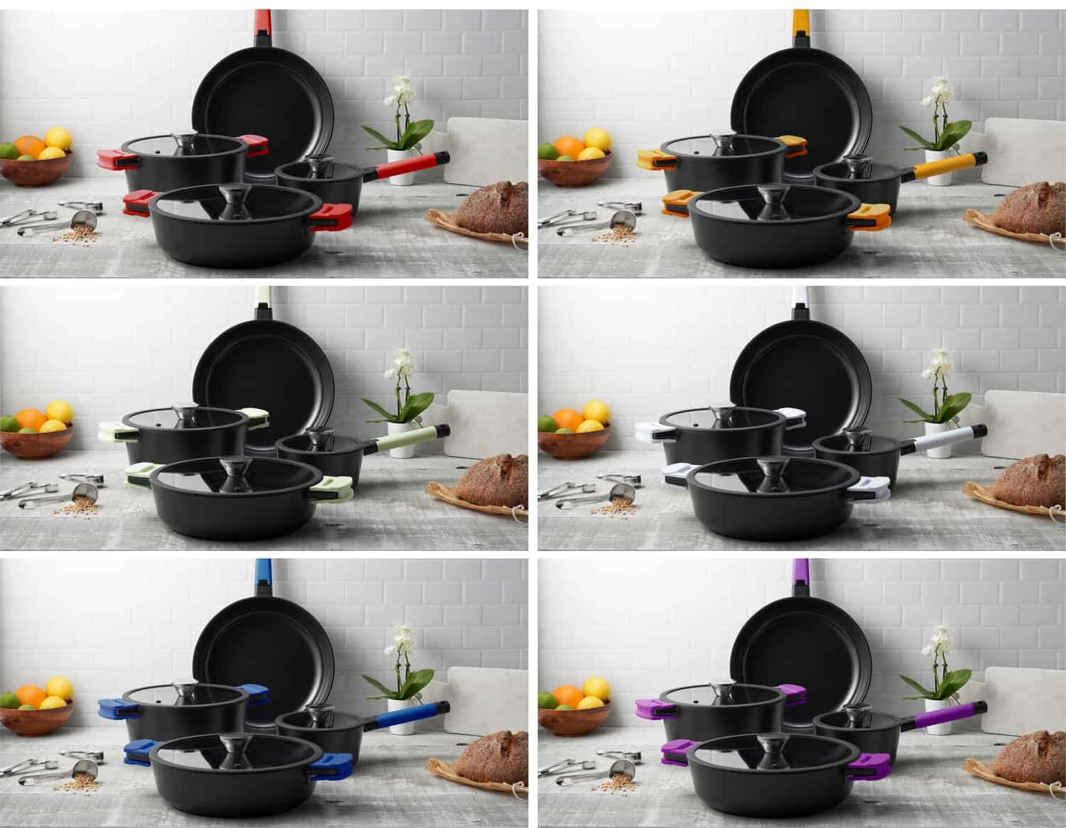Colourful accessories for the Noir 7 Piece Cookware Set, which features removable long handles and silicone grips for side handles. They provide a convenient removable solution for cleaning and storage as well as a comfortable, yet sturdy grip while cooking. Use them to identify allergy or diet-specific cookware, to match your kitchen, your cooking, or even the season.